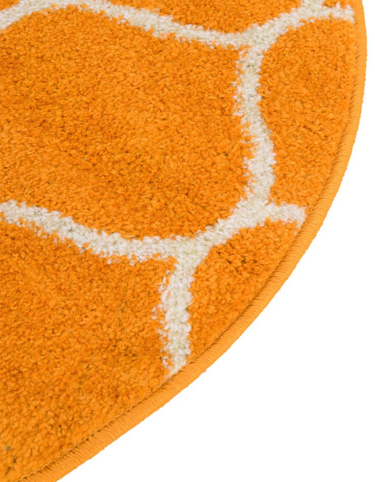 A vibrant 5' 3" round orange area rug with a modern white trellis pattern, perfect for adding a pop of color to any indoor space.