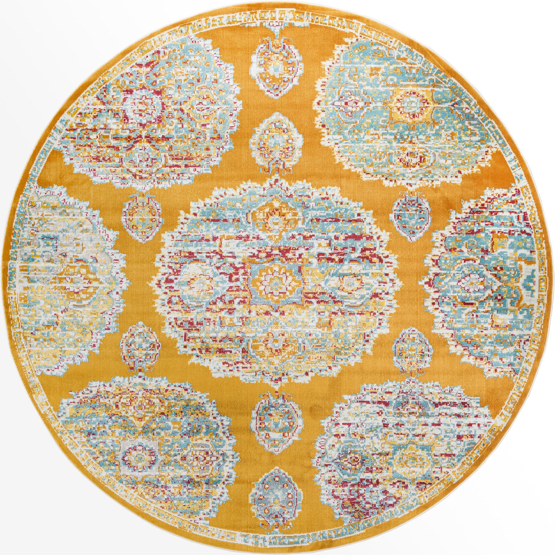Machine-made from 100% polypropylene, the rug has a low pile with a smooth, slightly lustrous surface and a soft hand underfoot. The construction keeps pattern details clear while maintaining a casual, approachable feel. Use it beneath a round dining table, at the center of a seating group, or layered over hardwood to introduce a cheerful focal point in bohemian, mid-century modern, or eclectic interiors; it pairs especially well with warm wood tones, neutral upholstery, and brass or matte black accents.