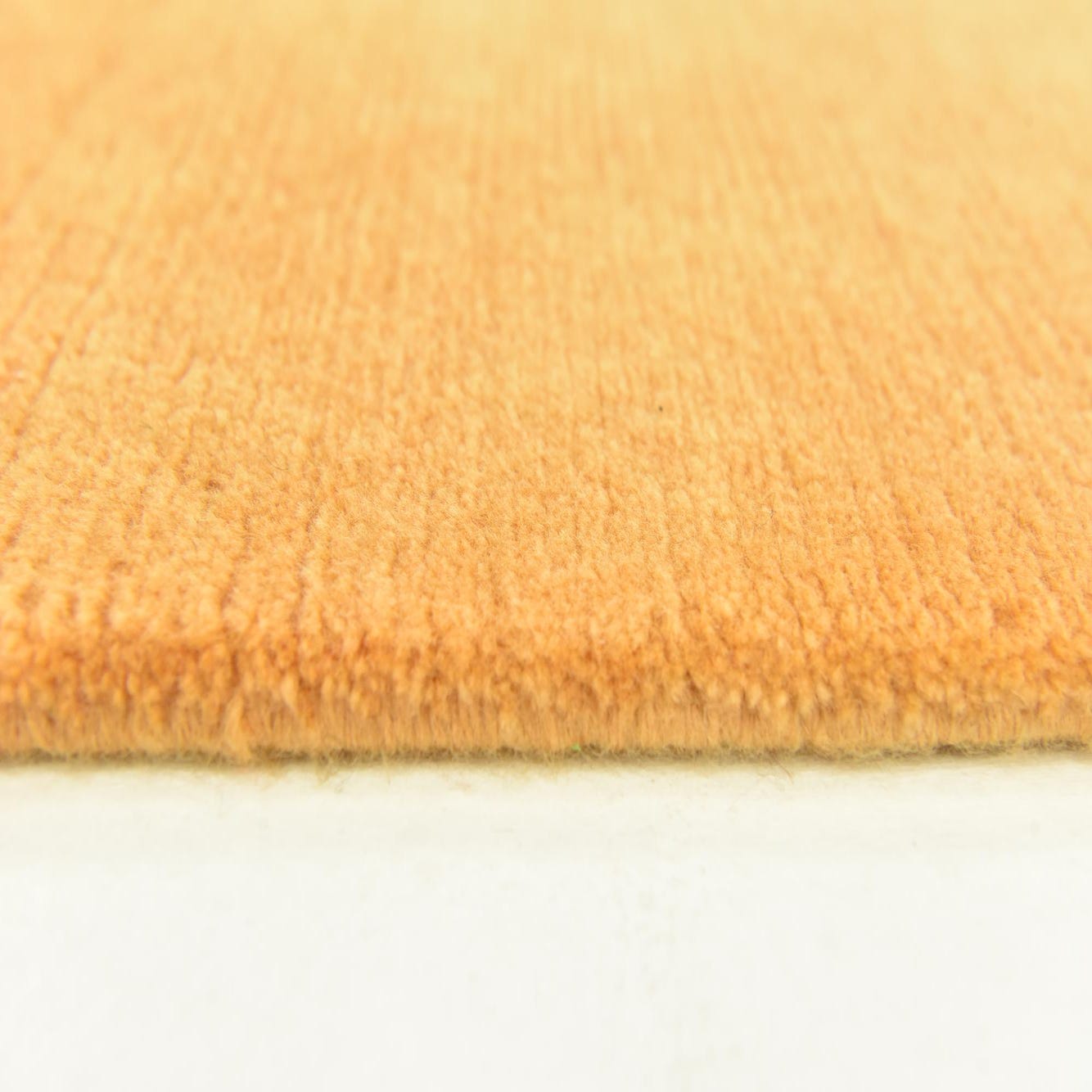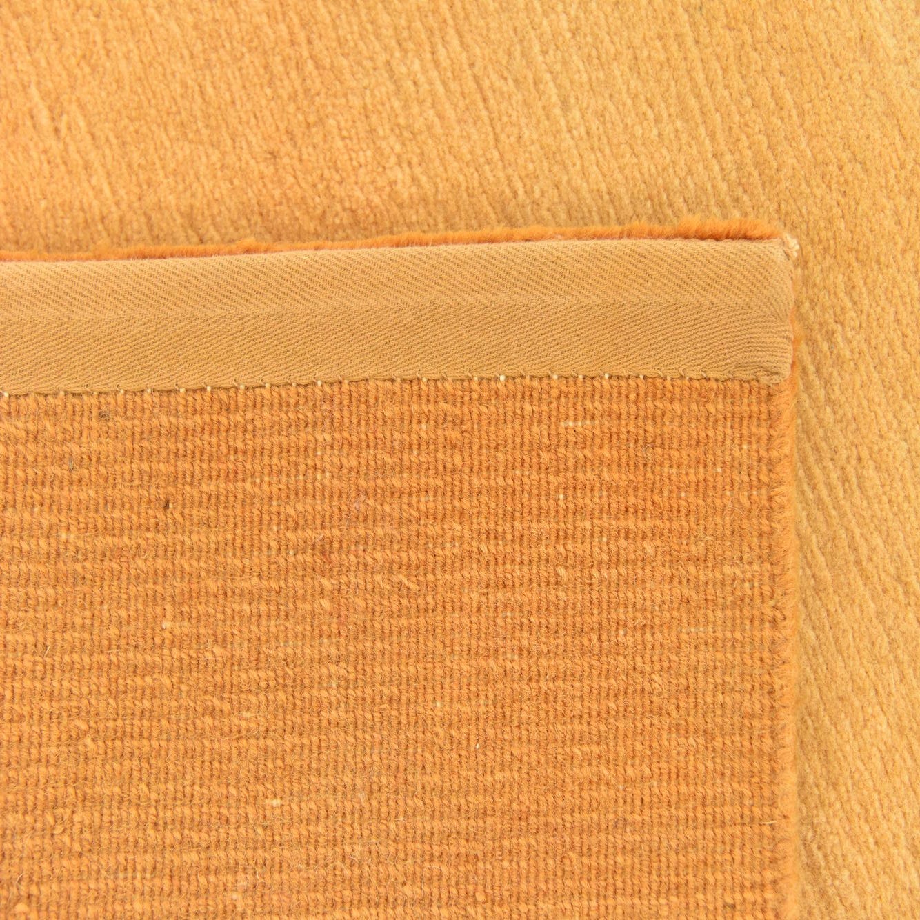 The Nepal Collection offers this hand-knotted 5 Ft runner, crafted from 100% wool, providing a soft and durable surface. Its design features a calming gradient of warm hues with a prominent orange background, complemented by subtle variations of beige and gold. These gentle tonal shifts create a minimalist pattern that echoes modern artistry and serene landscapes.