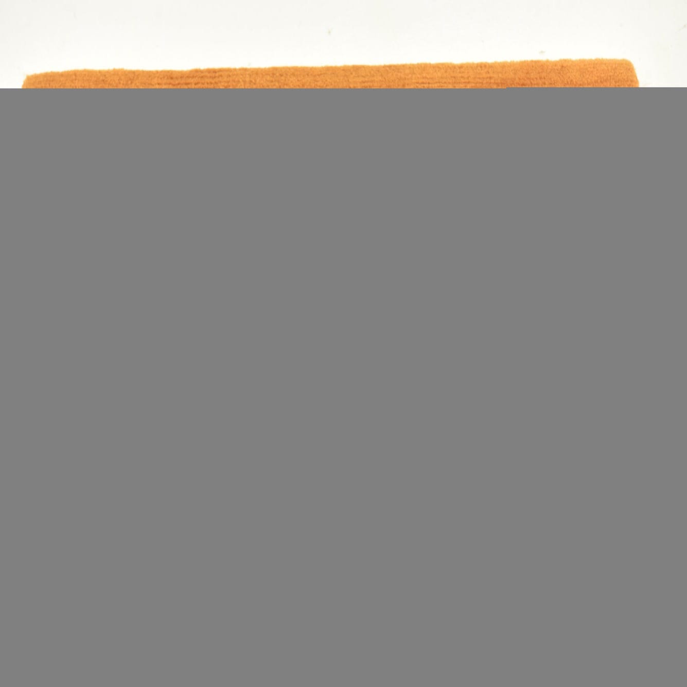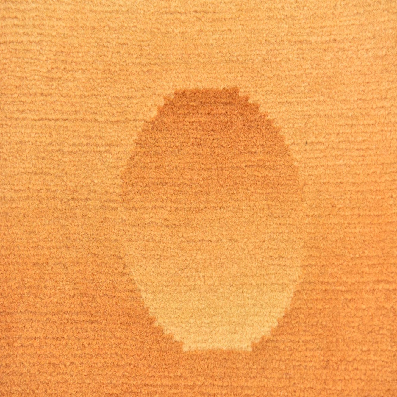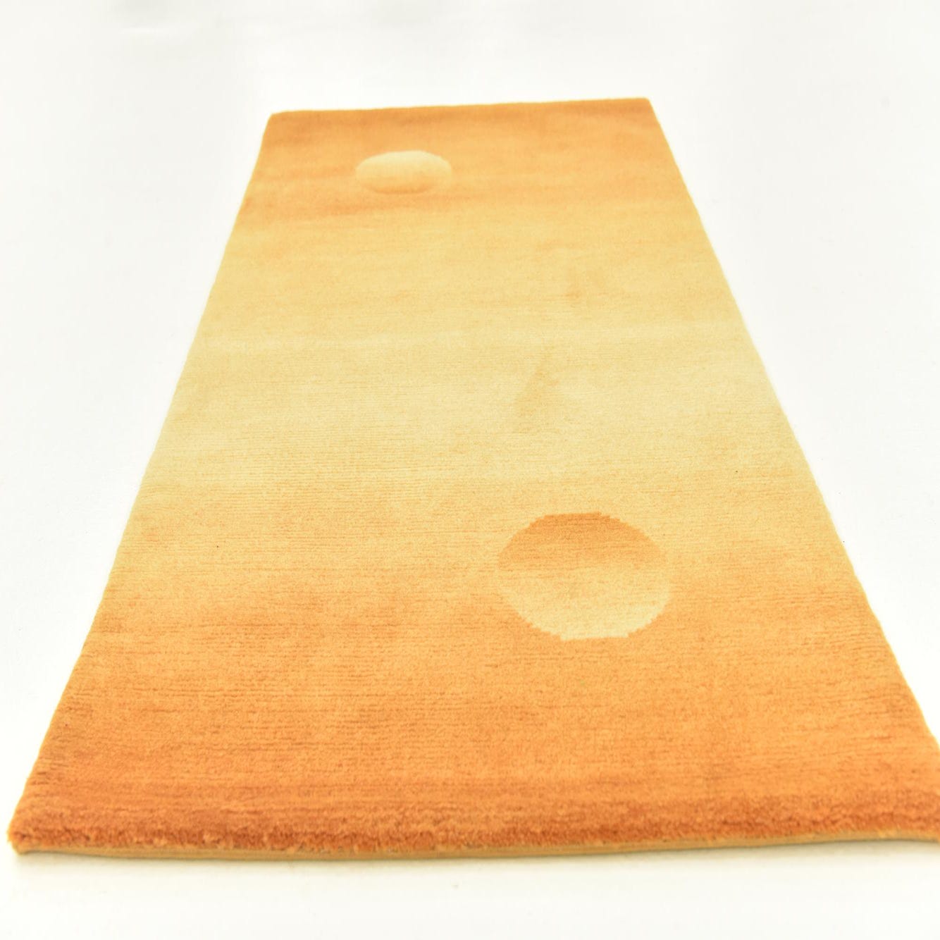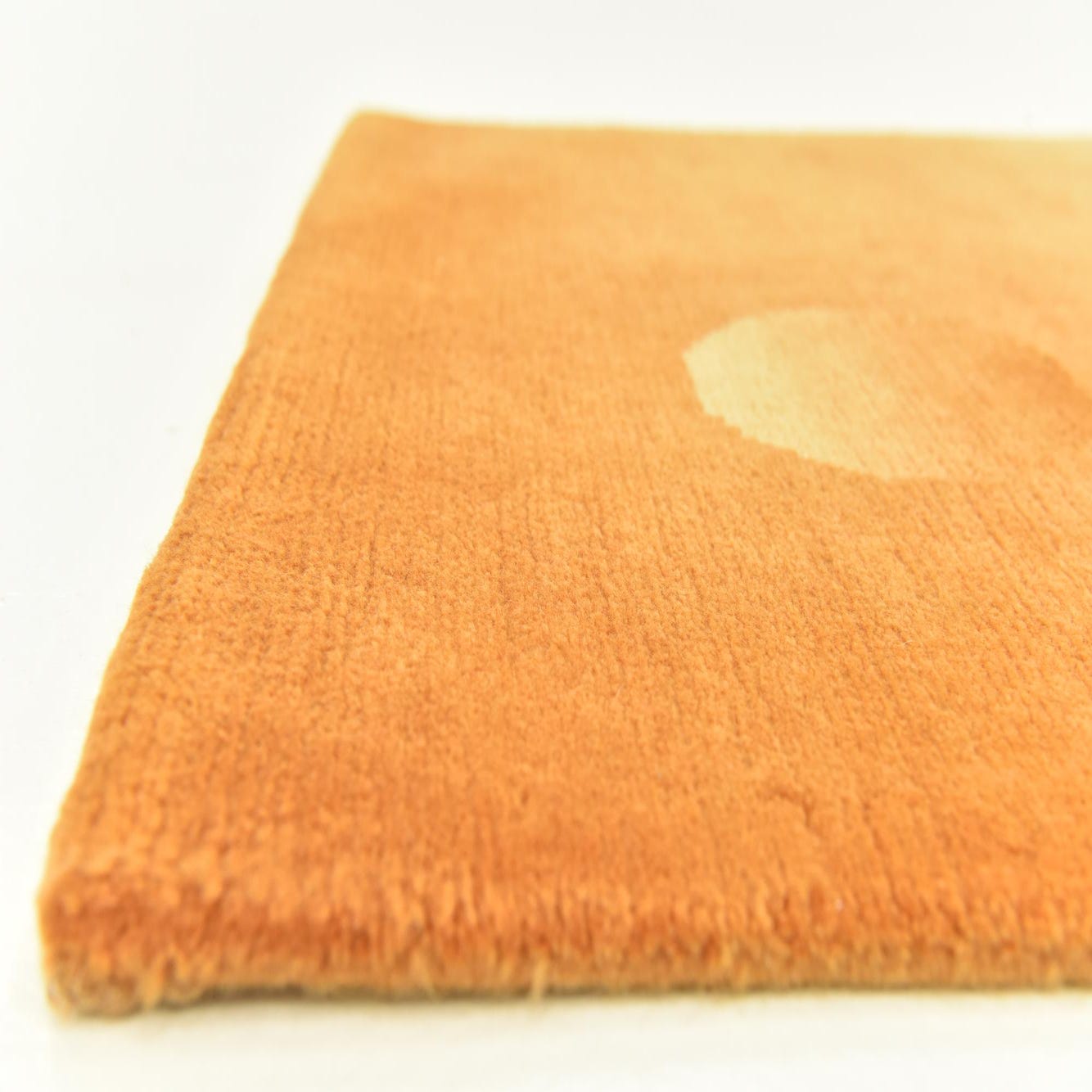 A 5 ft orange wool runner rug with two subtle, raised circular patterns, perfect for a modern hallway.