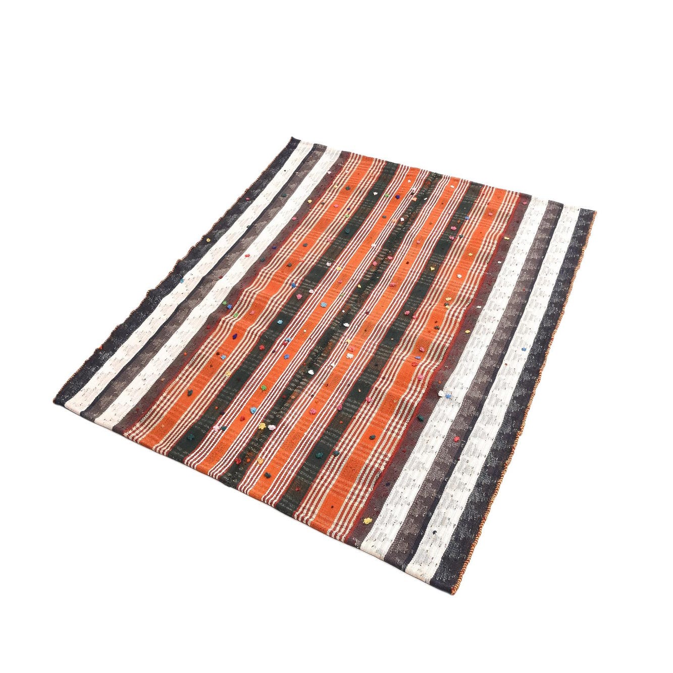 This hand-made Jajim collection rug presents a dynamic blend of orange, black, white, and green stripes accentuated by colorful flecks embedded within its woolen weave, delivering a distinctive sense of texture and visual depth. The striped pattern of this 5 Ft Square piece is both bold and approachable, allowing it to serve as a focal point or complement existing decor seamlessly.
