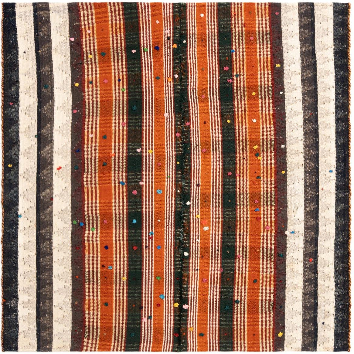 A handmade 5' 0 x 5' 7 Jajim square rug with bold orange, dark green, and cream stripes, accented with colorful confetti-like dots.