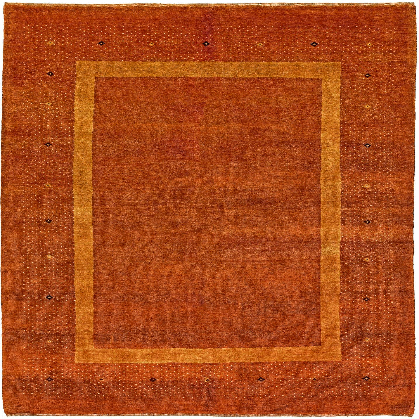 A 5x7 rectangular Gabbeh rug in rich orange wool, featuring a solid center and a border with subtle abstract dot patterns.