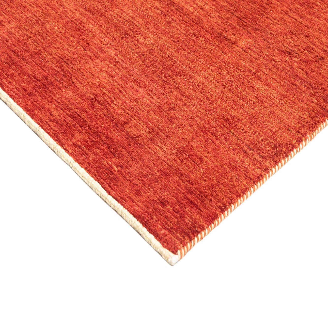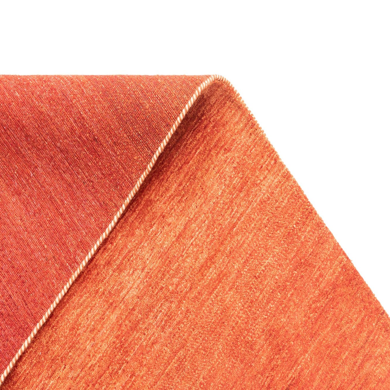 A 5x8 rectangular indoor rug in varying shades of orange, featuring a medium pile and a handmade texture.