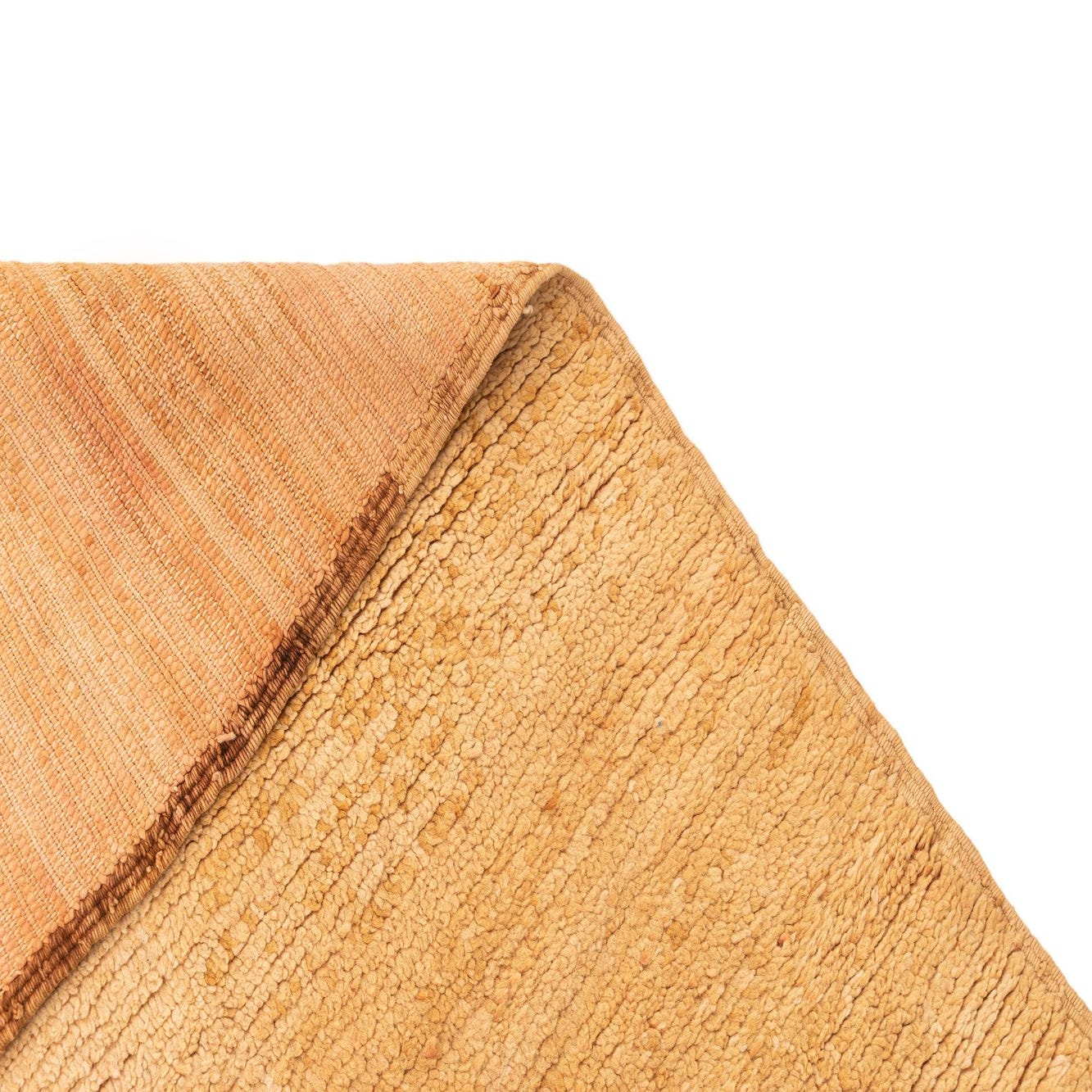 Hand-knotted in wool, this rug presents a warm orange field with a quiet, organic patterning created by subtle horizontal banding and the gentle seam lines from its construction. The color is solid at first glance but reveals soft tonal shifts where the hand-knotting creates light-catching variations. The surface has a plush, slightly uneven pile that invites bare feet—soft and dense underfoot with low ridges that give the rug tactile depth. Small, relaxed tassels and an irregular edge complete the handcrafted character.