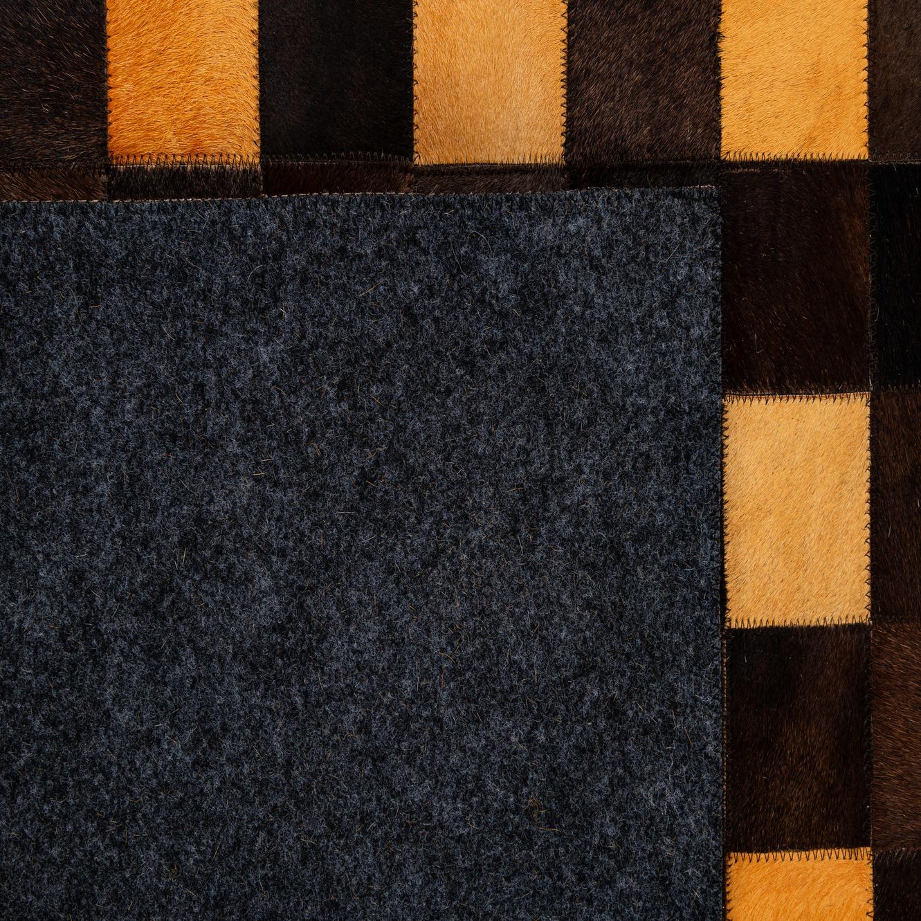A 5x8 rectangular Cowhide - Patchwork rug featuring a modern checkerboard pattern of dark brown and varied orange squares.