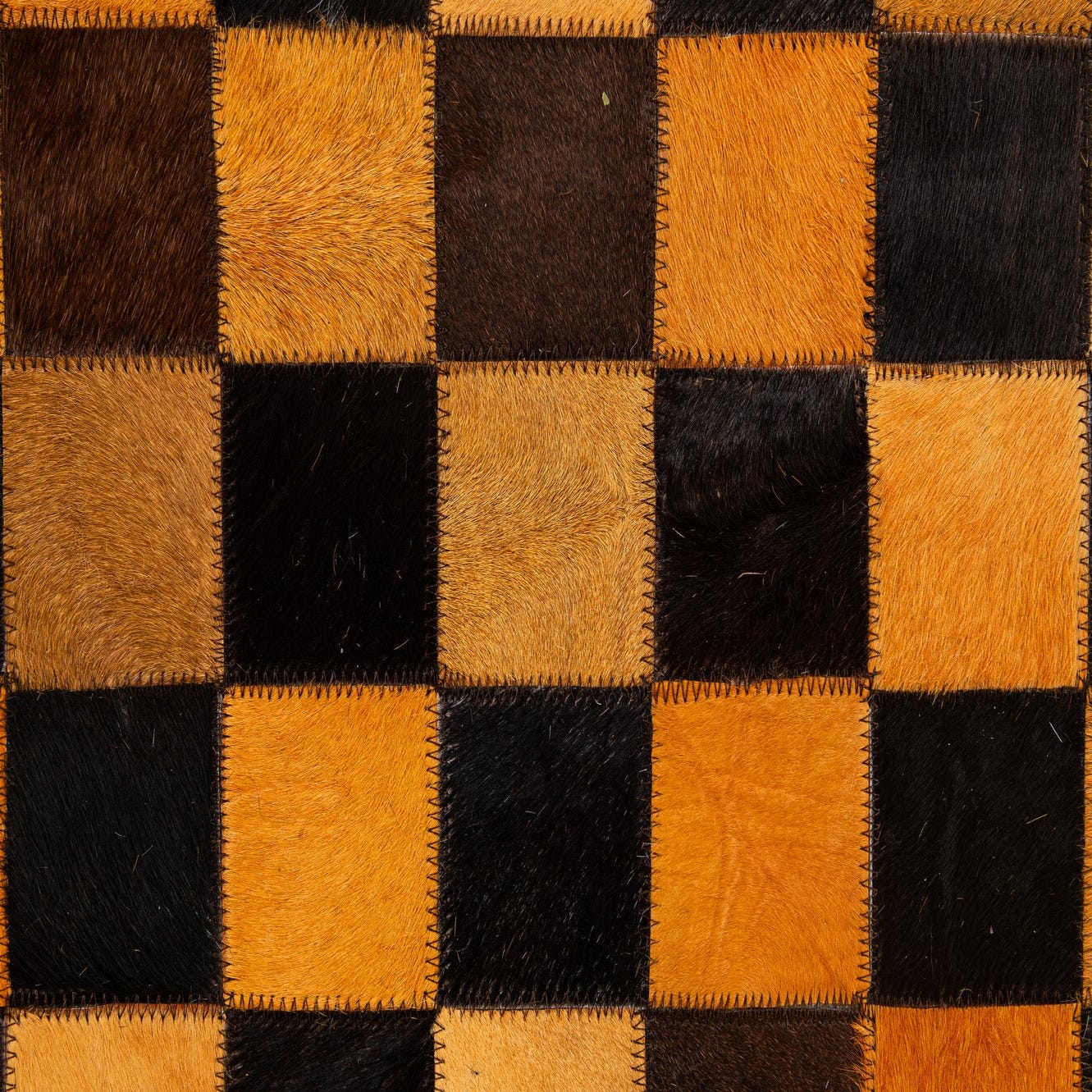 A 5x8 rectangular modern cowhide rug featuring a checkerboard pattern of orange and dark brown patches.