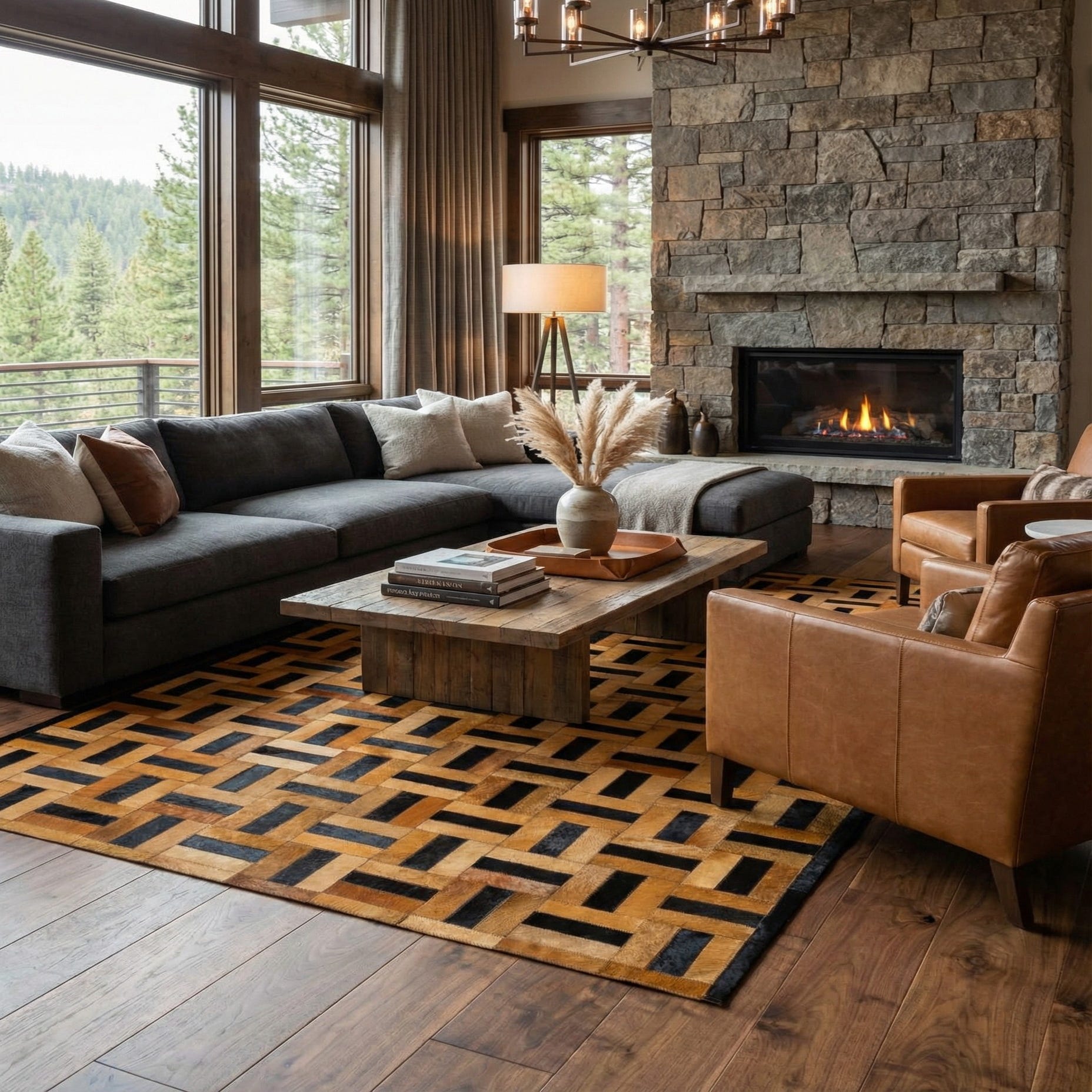 The warm palette and graphic rhythm work well in mid-century modern, rustic-contemporary, or eclectic interiors. Use it to anchor a seating area, layer it over wood floors beneath a dining table, or set it in an entryway to introduce color and texture. Pair with natural wood furniture, leather upholstery and woven textiles to emphasize the rug’s tactile, crafted character.