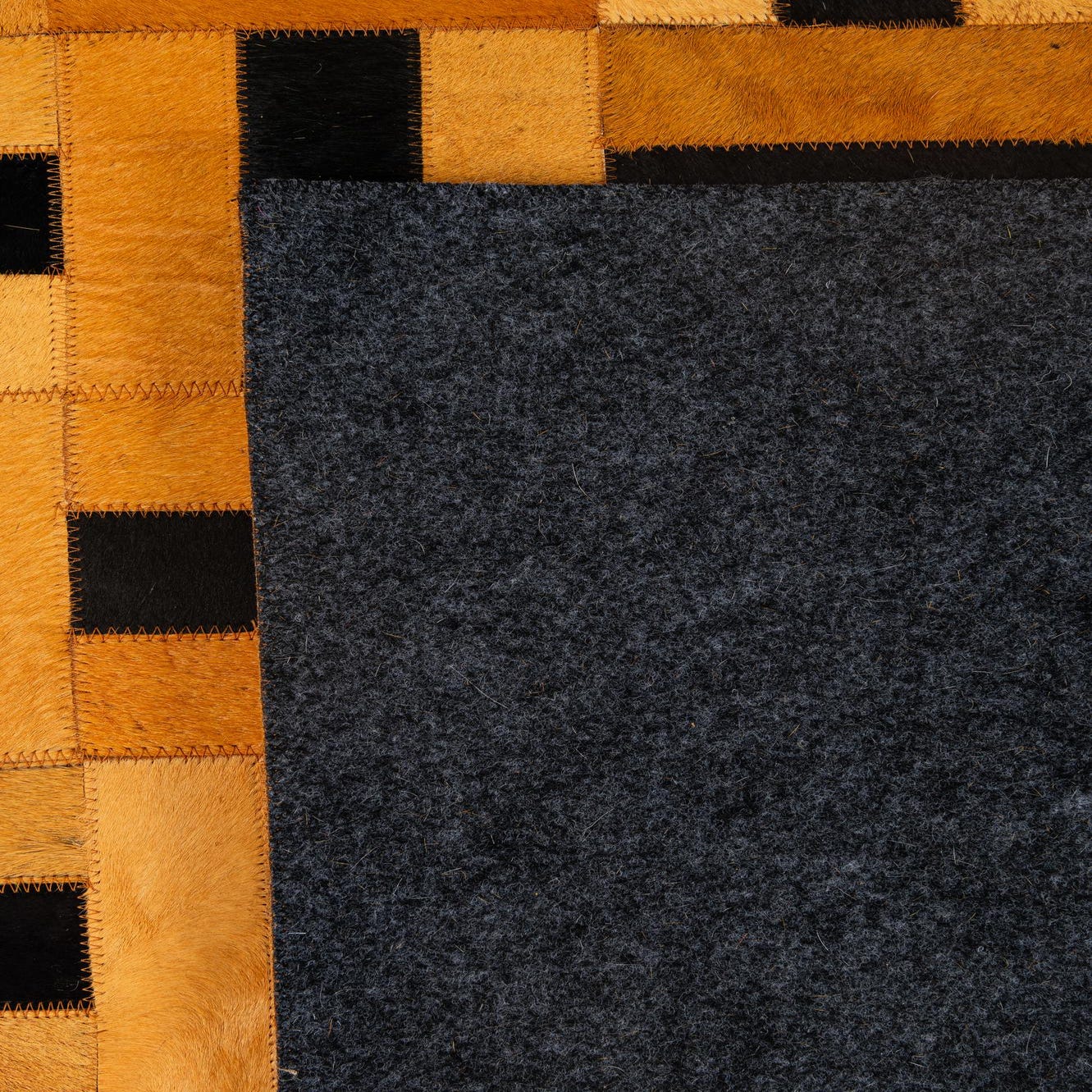 Handmade of cowhide and leather, this patchwork rug arranges rectangular hide panels into a tight geometric, basketweave-like pattern. A warm orange background carries the design while varying shades of brown form short vertical and horizontal bars that punctuate each square. Running a hand over the surface reveals the short hair of the hide, a subtle natural sheen, and the defined seams where each patch is hand-stitched, with smooth leather edging that provides a clean, structured finish.