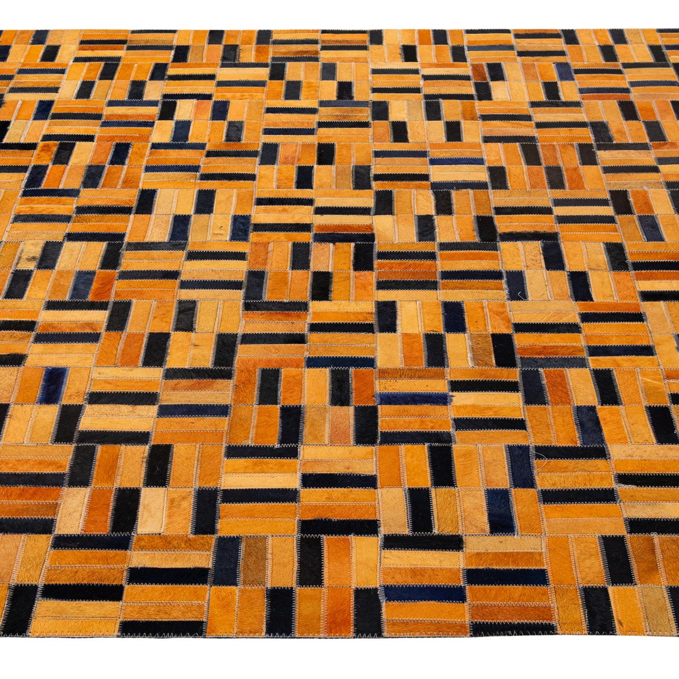 A 5x8 rectangular cowhide rug featuring a modern patchwork stripe pattern in varying shades of orange and dark blue.