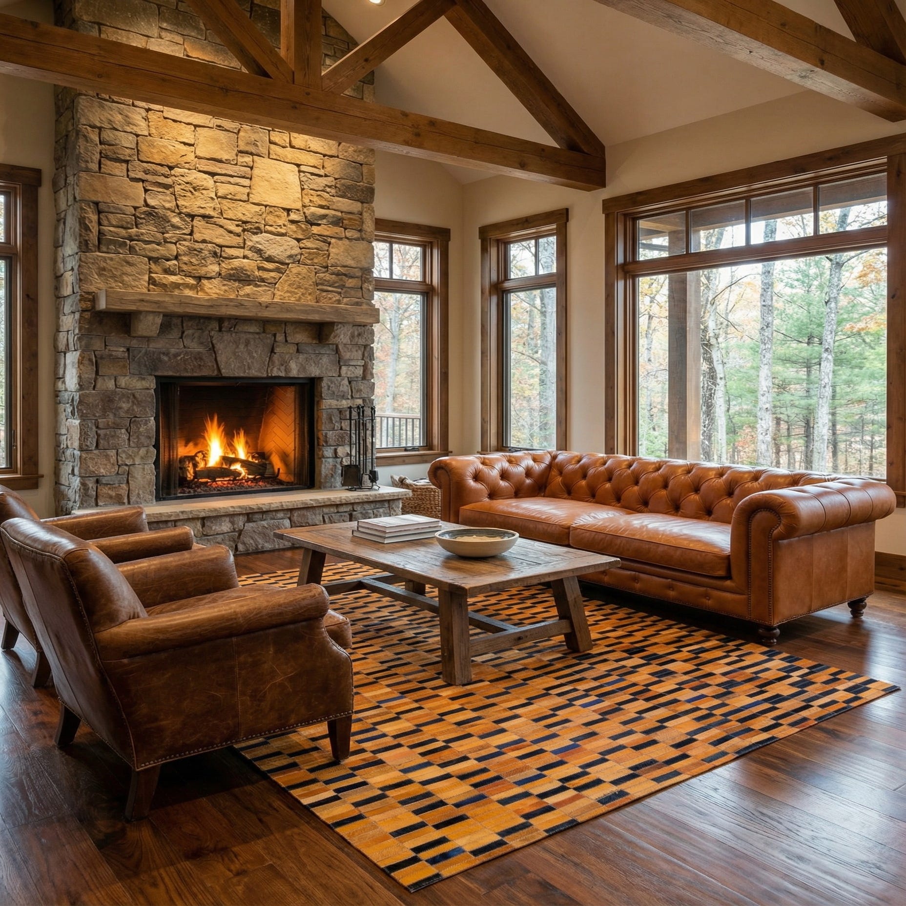 A 5x8 rectangular cowhide rug with a modern stripe pattern in varying shades of orange and black, suitable for a living room.