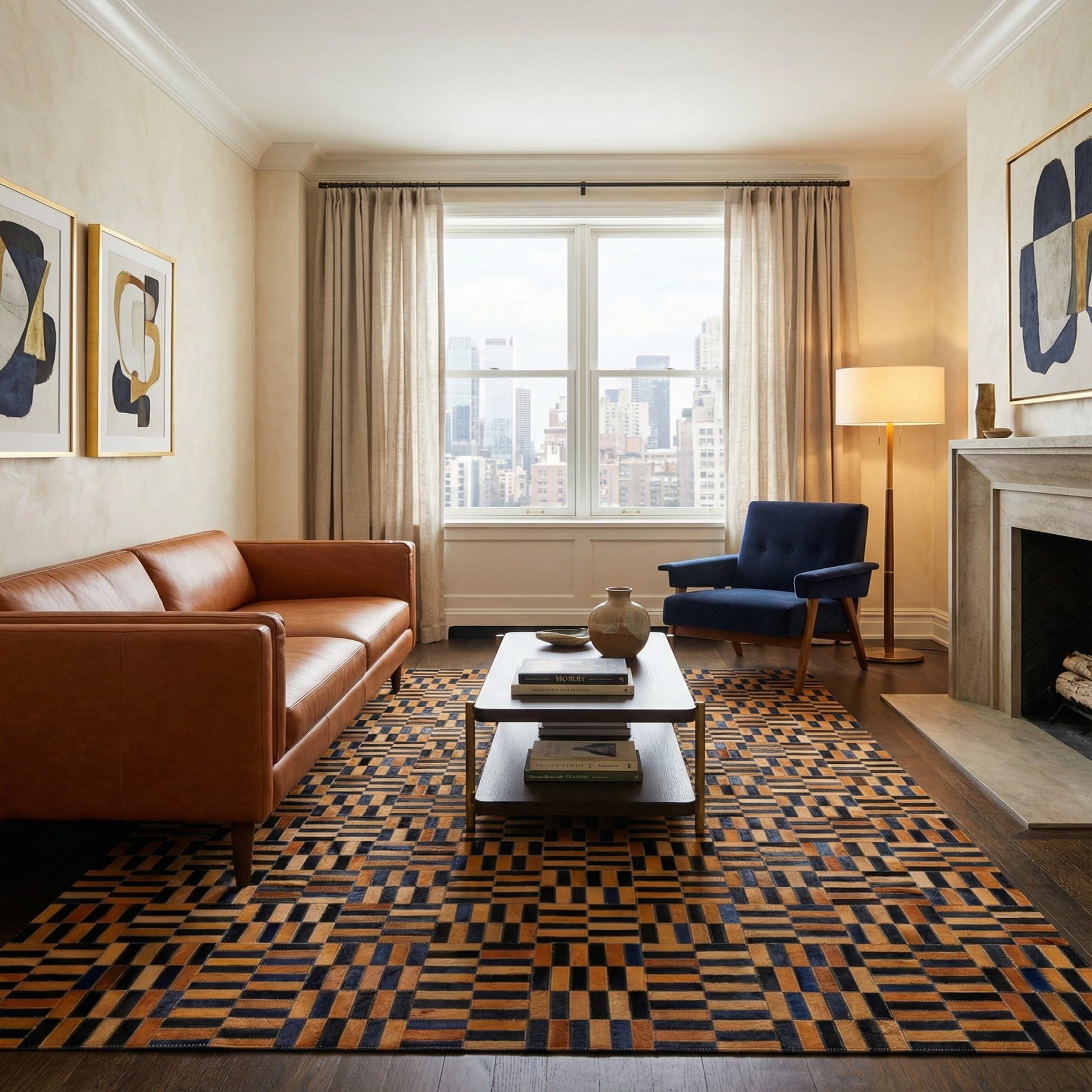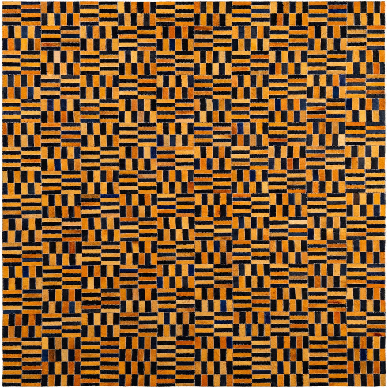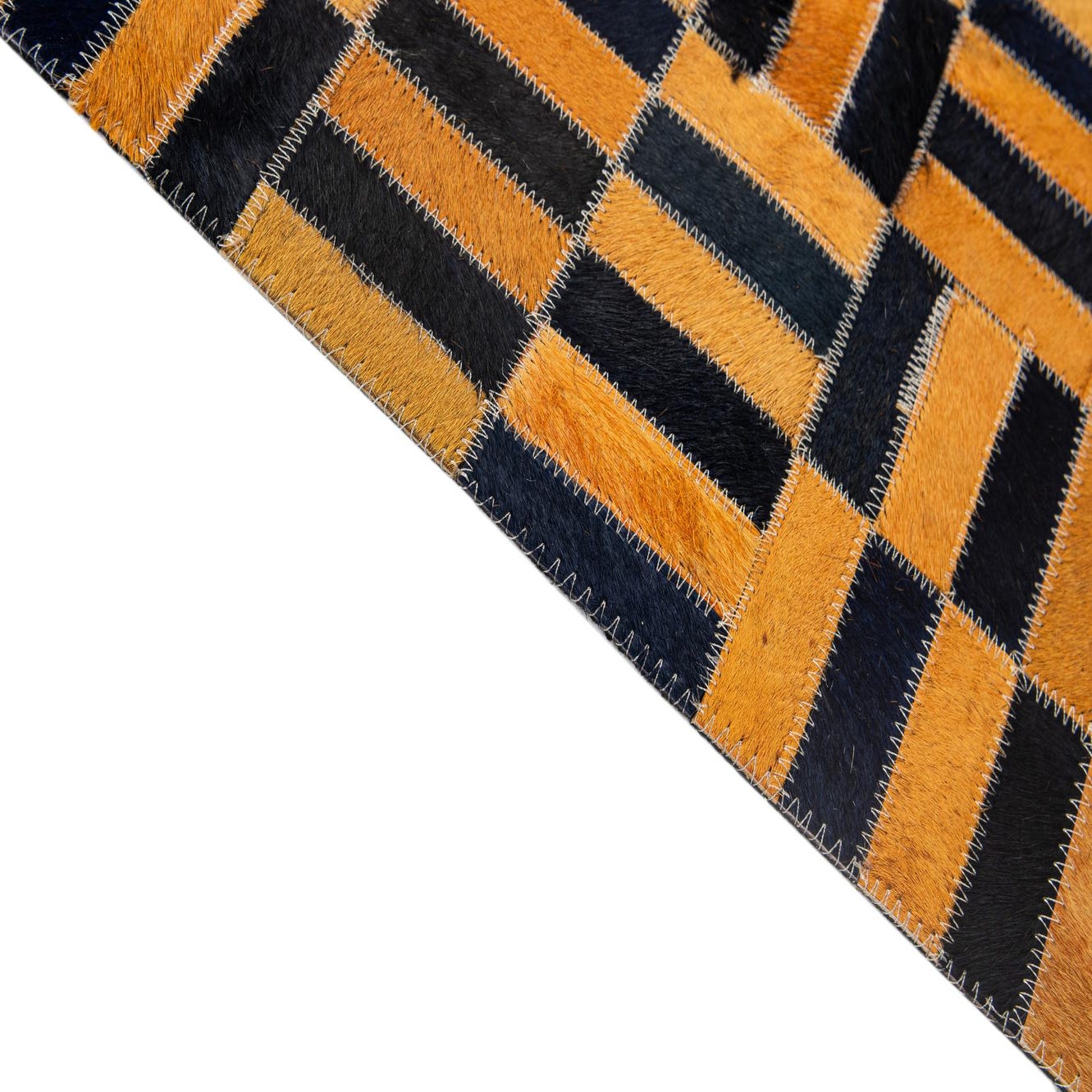 A 5x8 rectangular Cowhide Patchwork rug featuring a modern stripe pattern in varying shades of orange and dark blue, suitable for a living room.