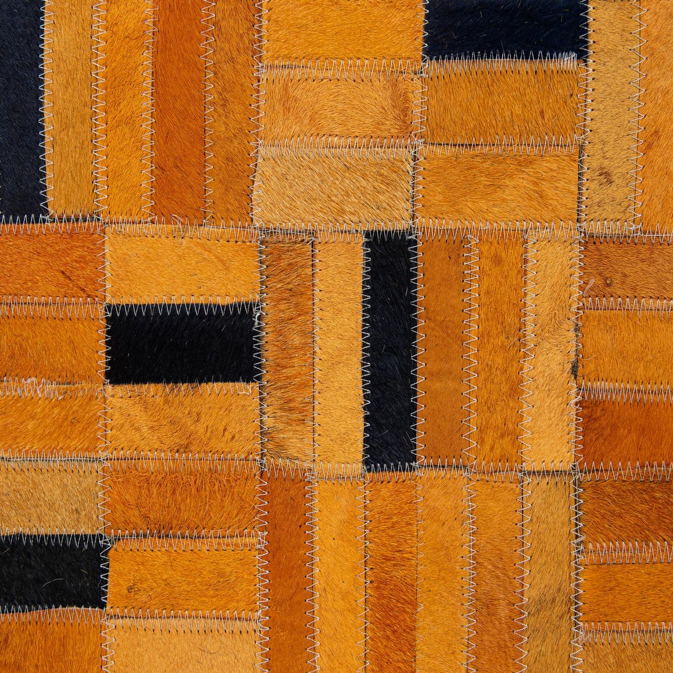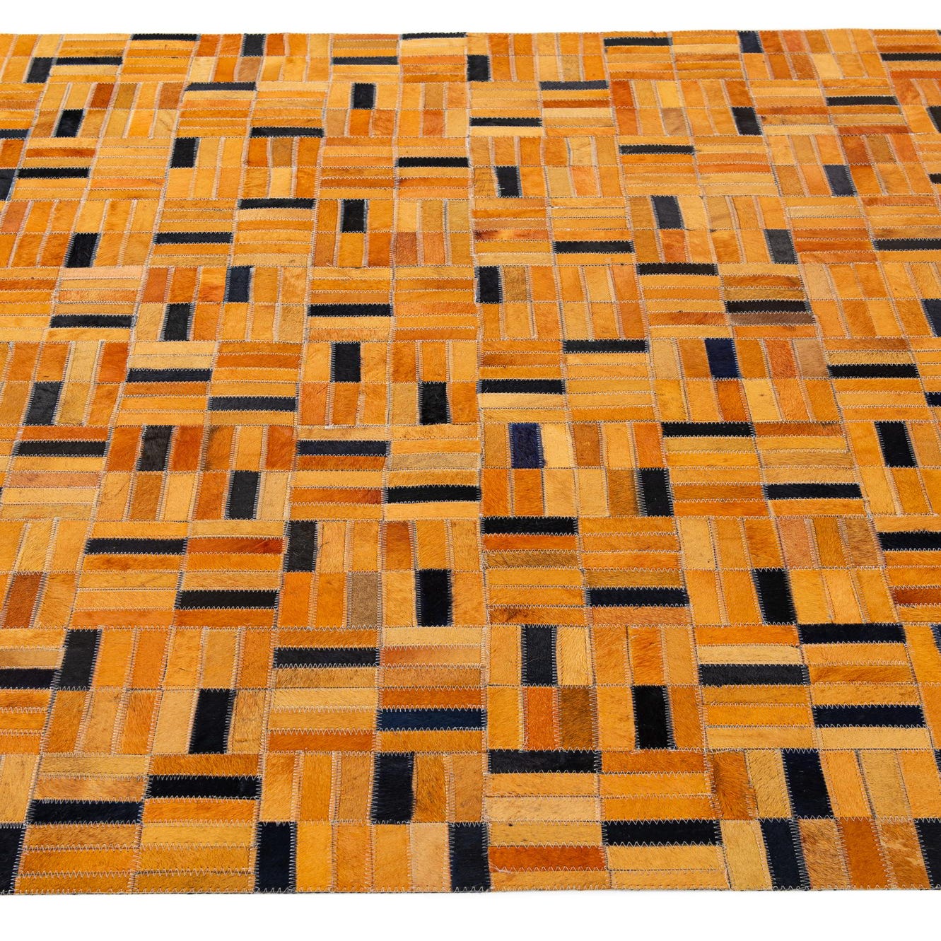 A 5x8 rectangular orange and black patchwork cowhide rug, featuring a modern stripe pattern, ideal for a living room.