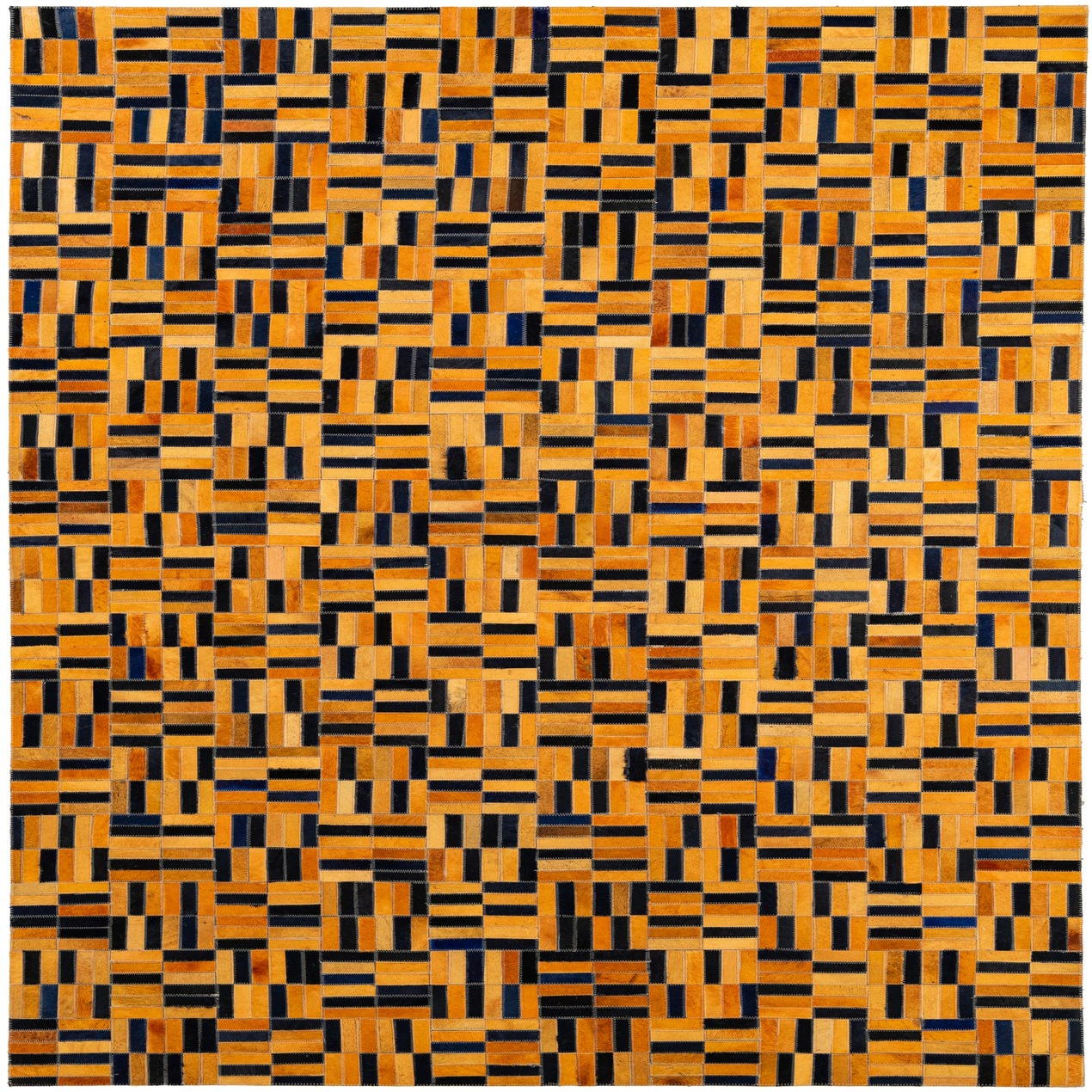 A 5x8 rectangular Cowhide - Patchwork rug featuring a modern stripe pattern in varying shades of orange and dark blue/black.