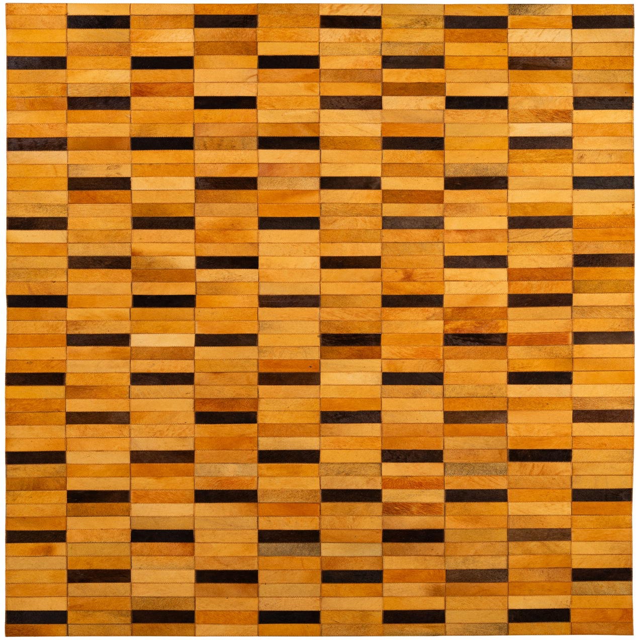 5x8 rectangular Cowhide - Patchwork rug featuring a modern stripe pattern in varying shades of orange and brown.