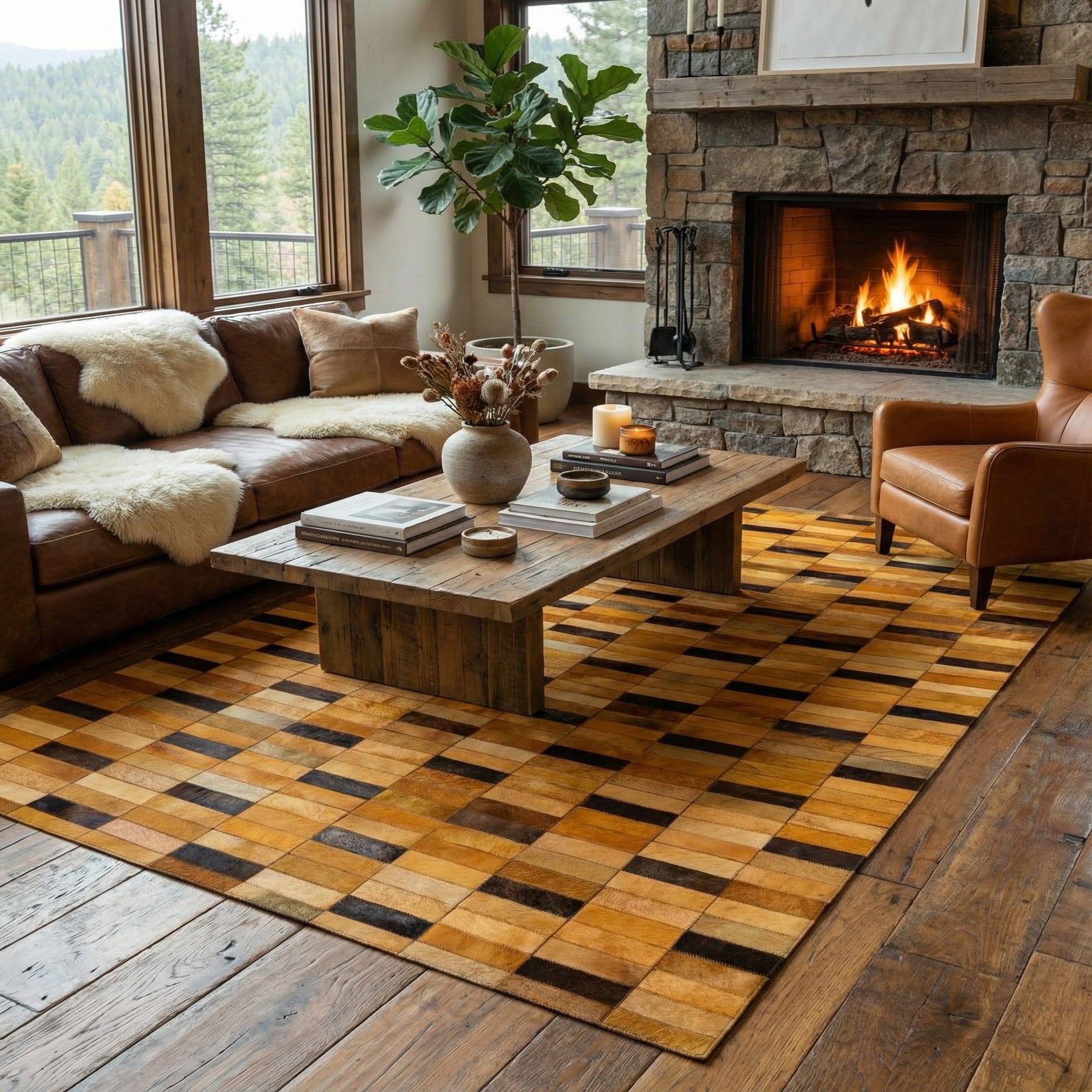 A 5x8 rectangular Cowhide Patchwork rug featuring a modern stripe pattern in varying shades of orange and black.