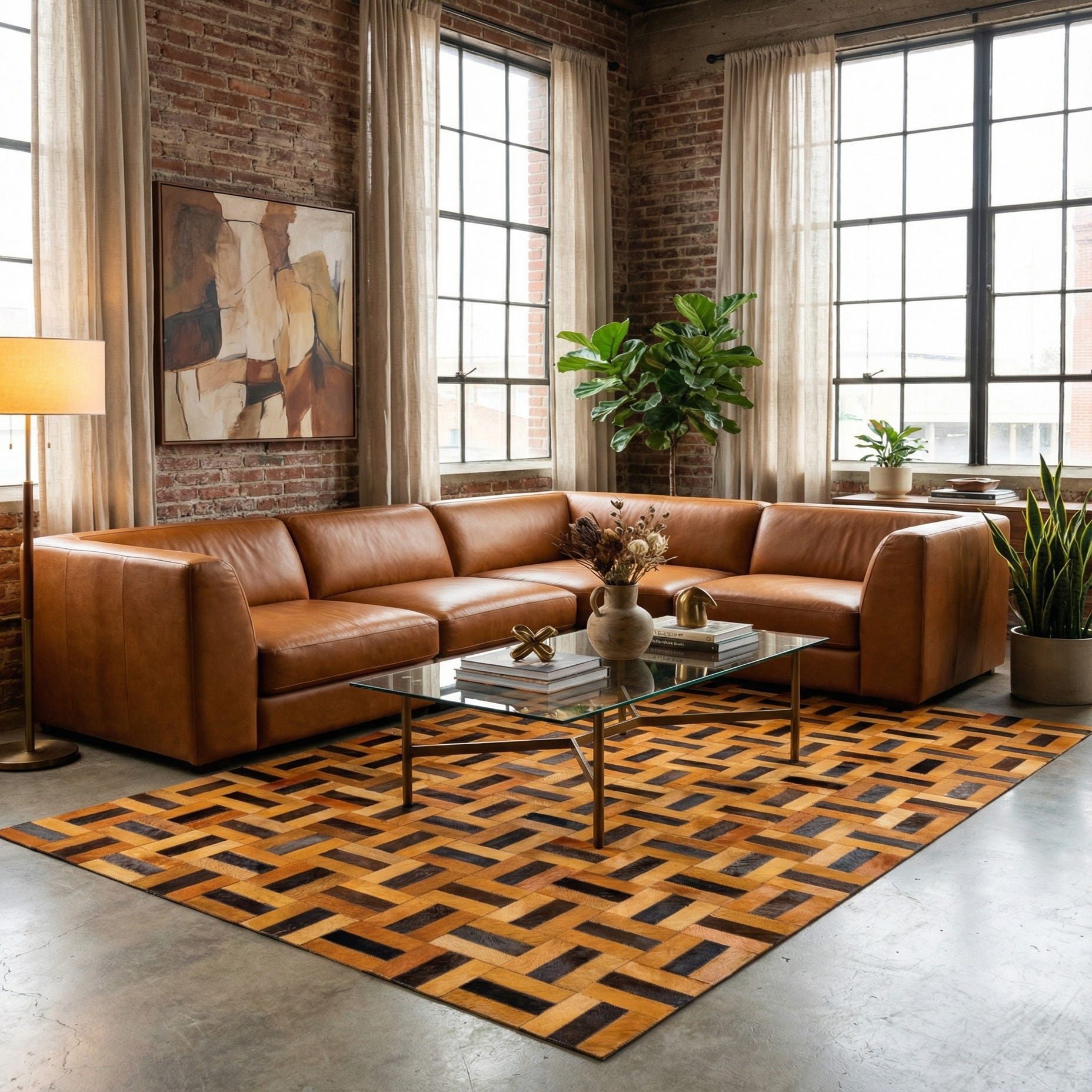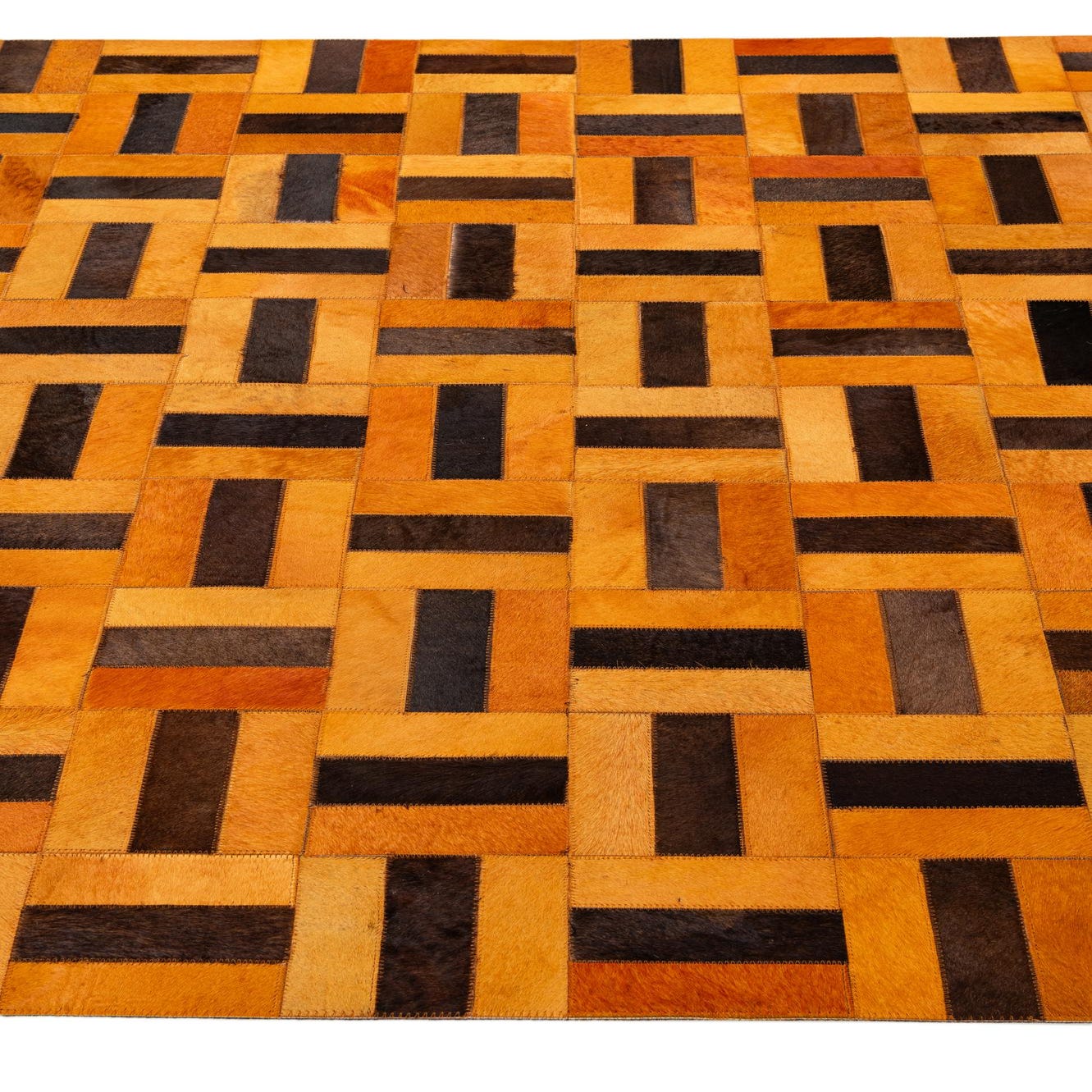 A 5x8 rectangular Cowhide Patchwork rug featuring a modern geometric pattern of alternating orange and dark brown leather squares.