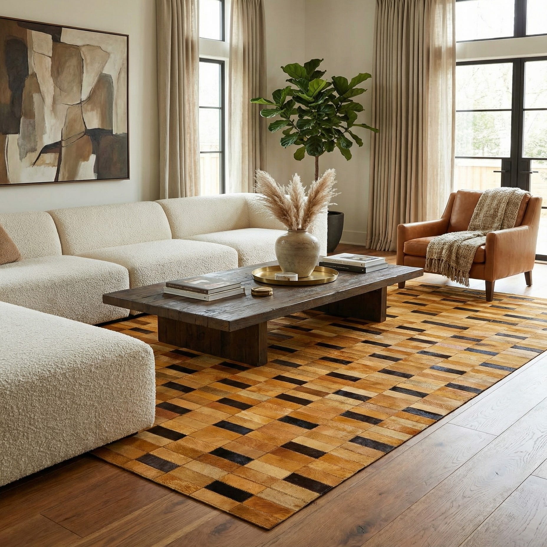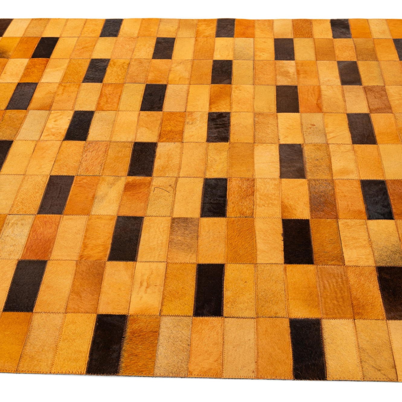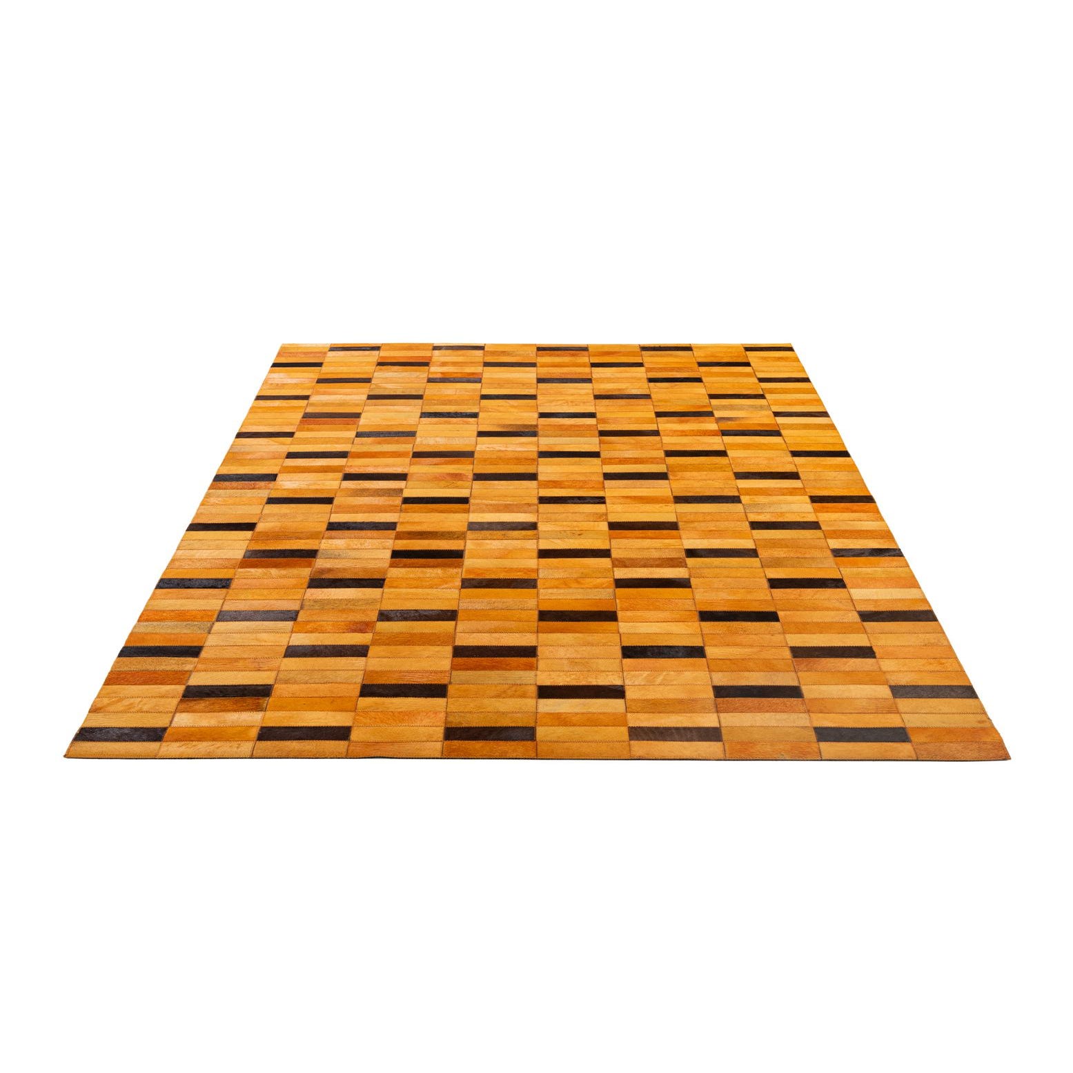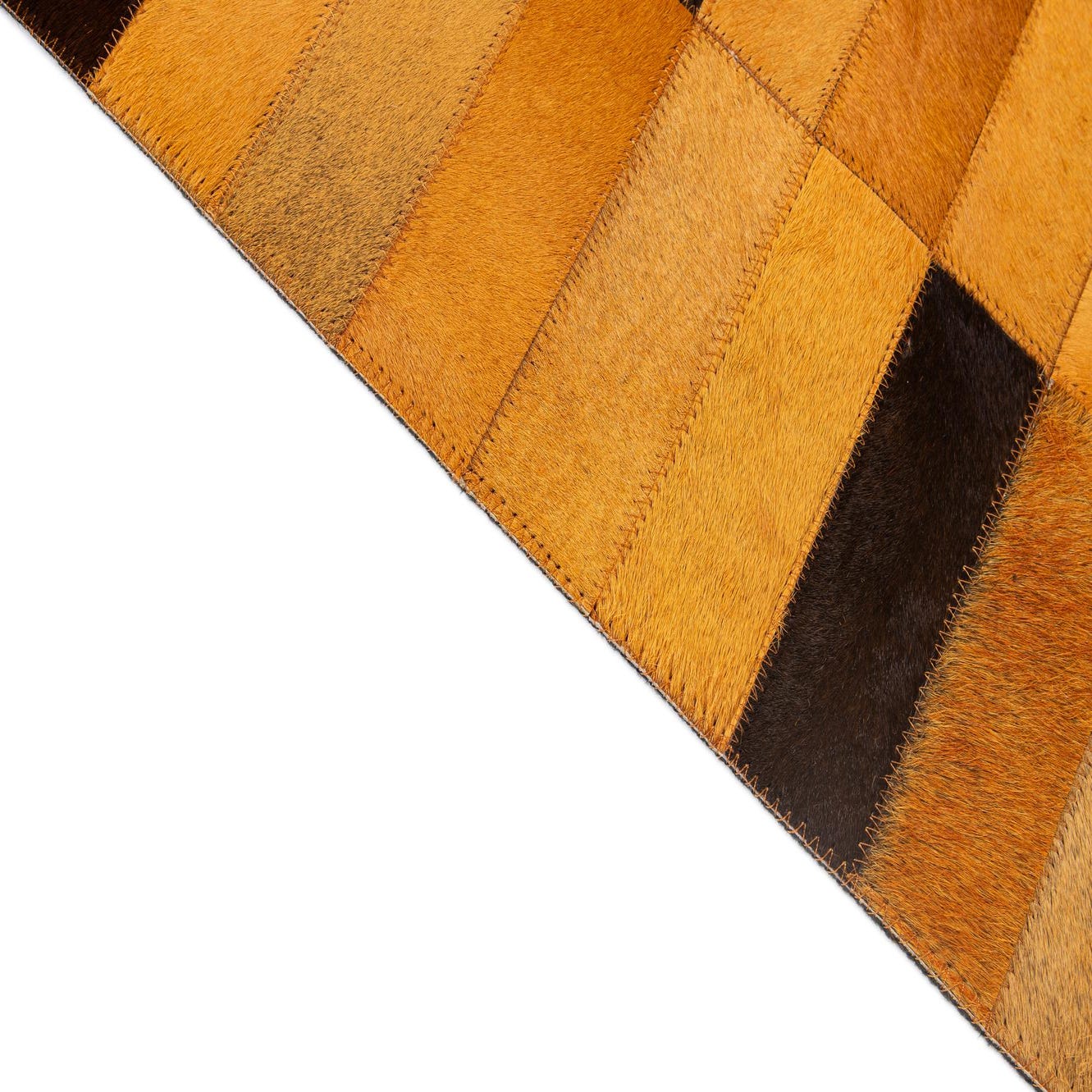 A 5x8 rectangular Cowhide Patchwork rug featuring a modern stripe pattern in varying shades of orange and dark brown.