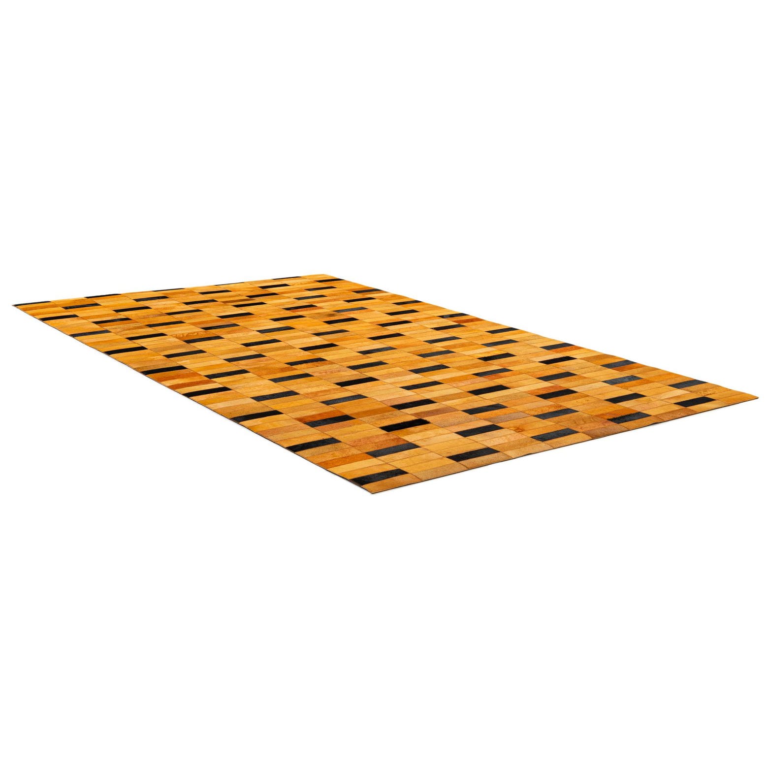 A 5x8 rectangular Cowhide - Patchwork rug featuring a modern stripe pattern of alternating orange and black rectangular patches.