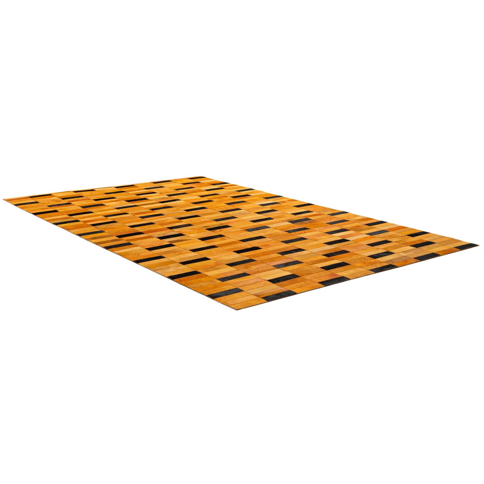 A 5x8 rectangular cowhide rug featuring a modern patchwork stripe pattern in varying shades of orange and black.