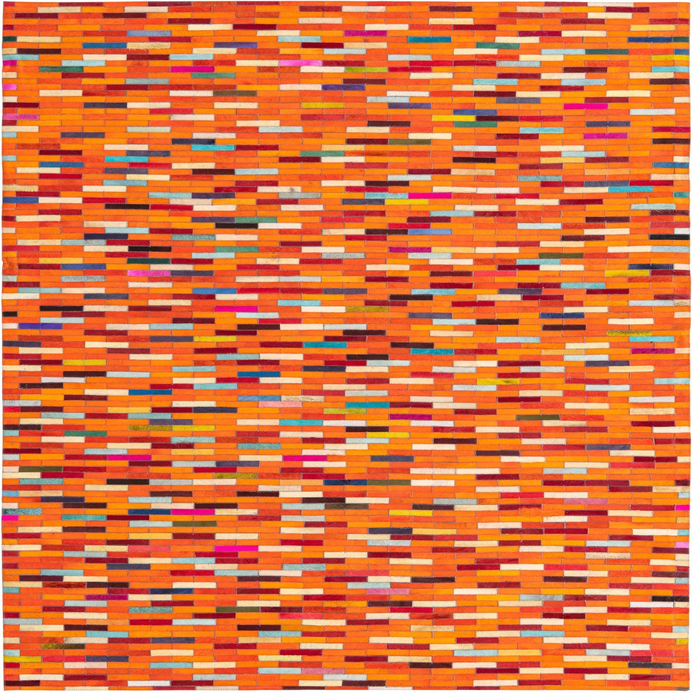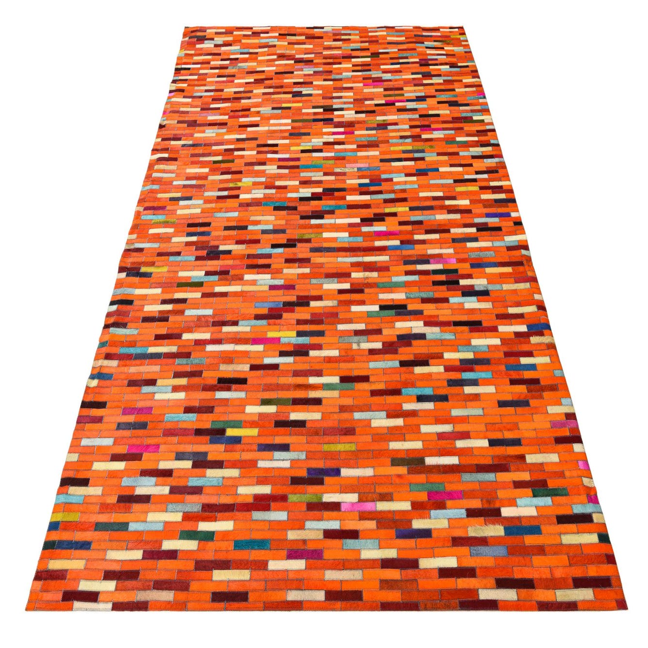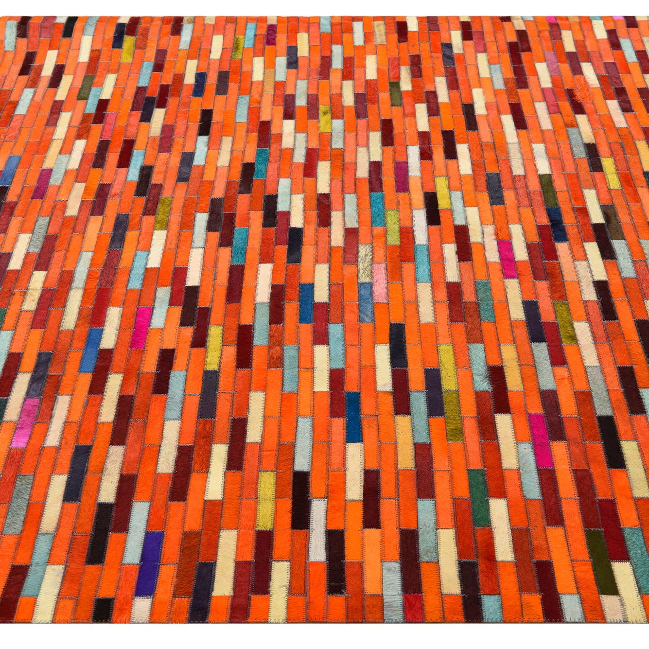 This Cowhide Leather 5x8 rug showcases a dynamic and vibrant design, featuring a lively array of colors on a warm orange background. The interplay of orange, brown, ivory, light blue, yellow, pink, and black hues forms a rich mosaic of hand-cut and stitched strips, creating an engaging and textured visual field. The craftsmanship of this hand-made piece reveals the unique character and individuality of each leather strip, providing not only visual appeal but also a distinct tactile experience.