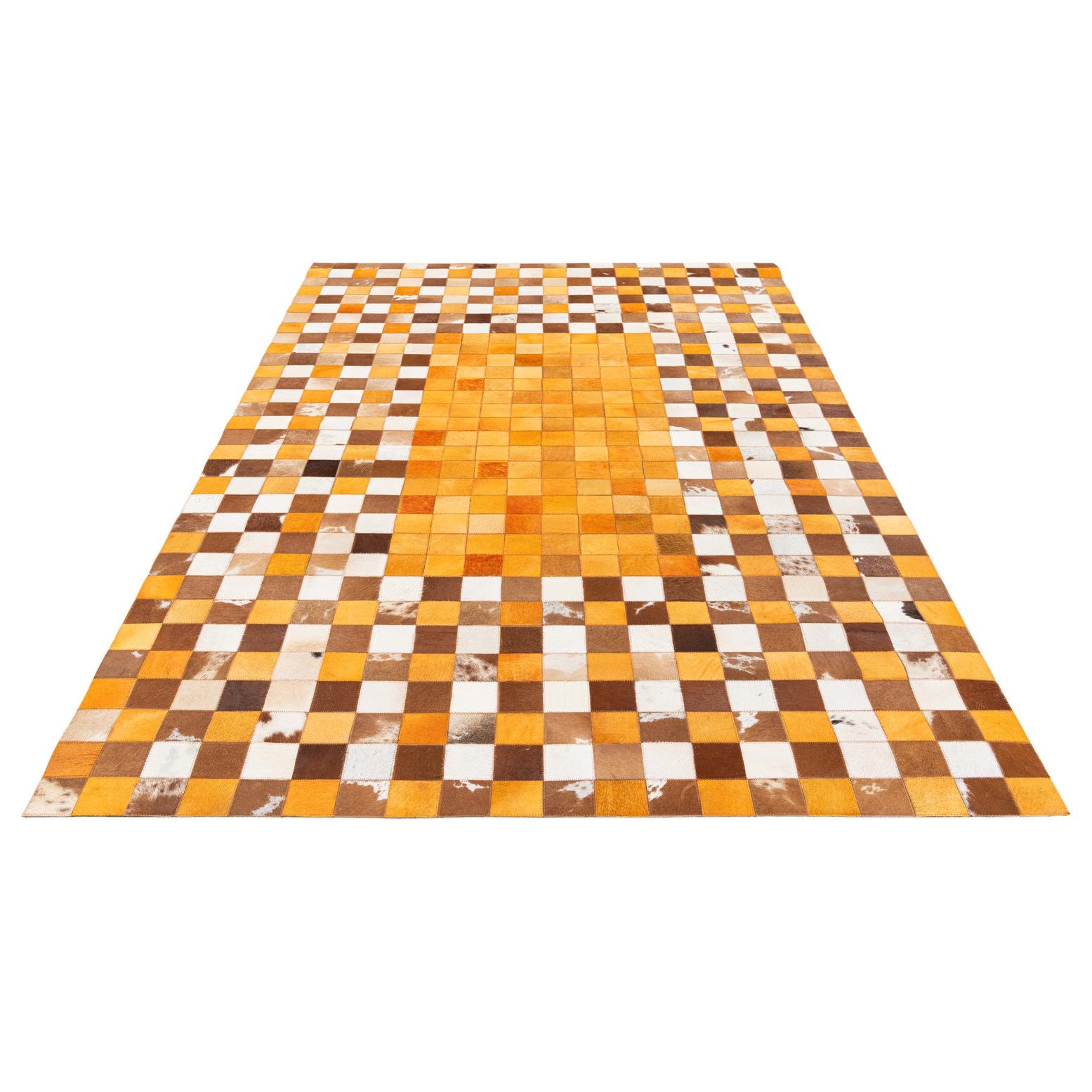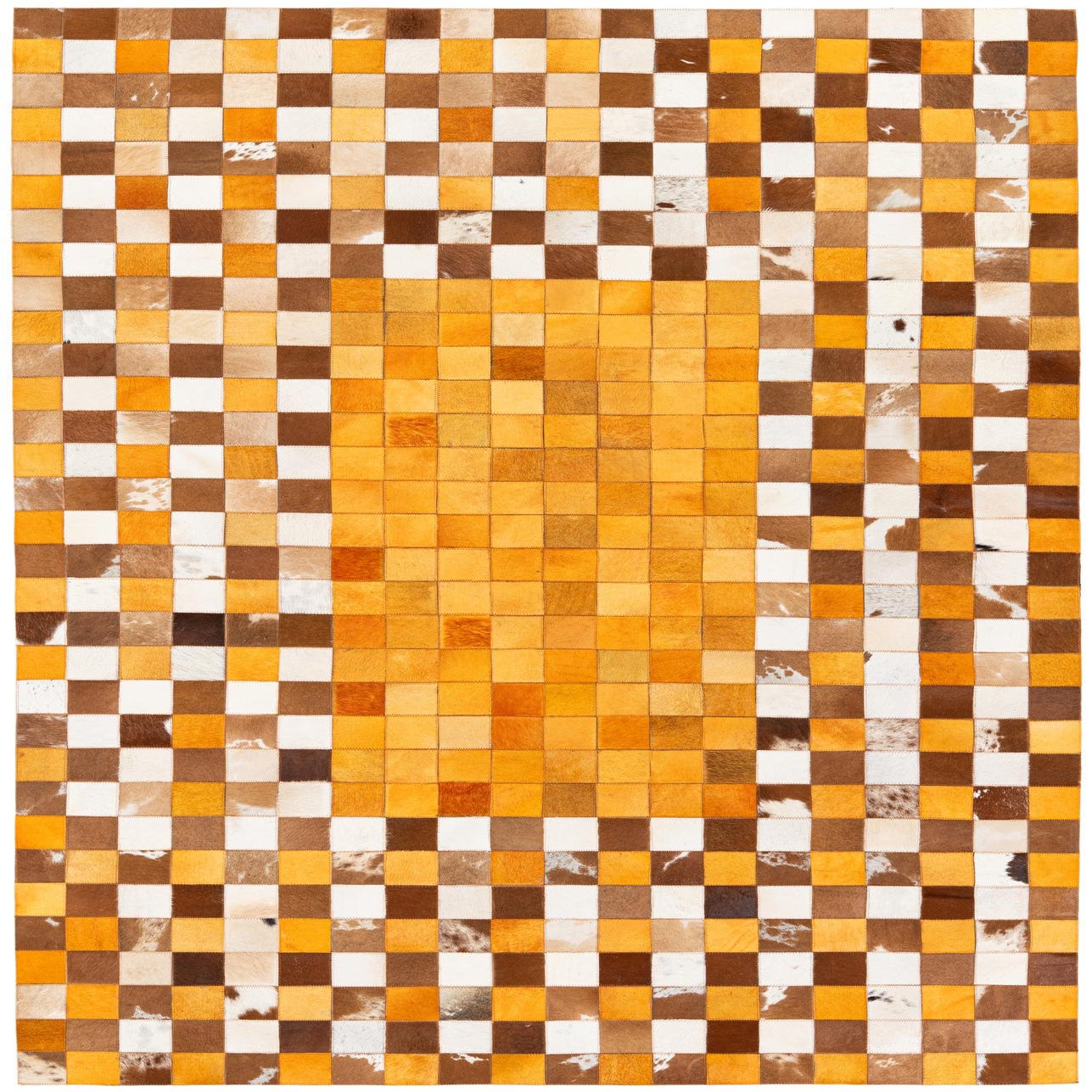 A 5x8 rectangular Cowhide Stocks rug featuring a modern checkered pattern in shades of orange, brown, and white.