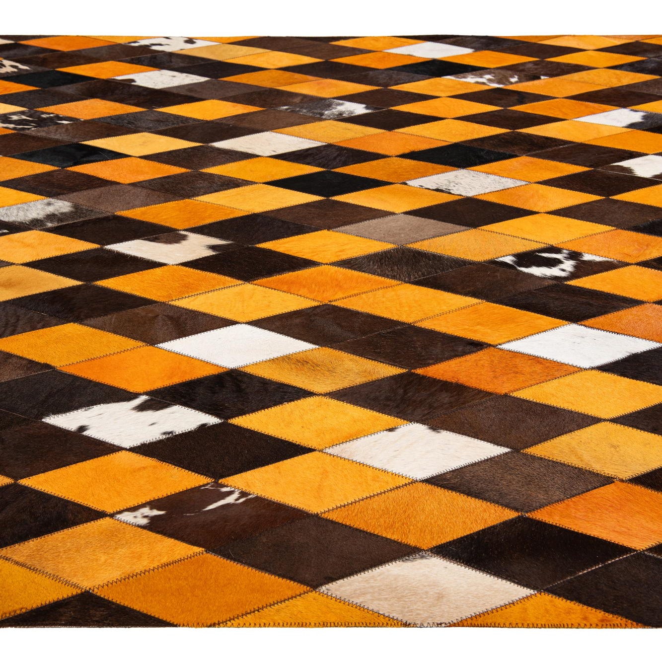 A 5x8 rectangular Cowhide Stocks rug by Rugs.com, featuring a modern diamond pattern in various shades of orange, brown, black, and white.
