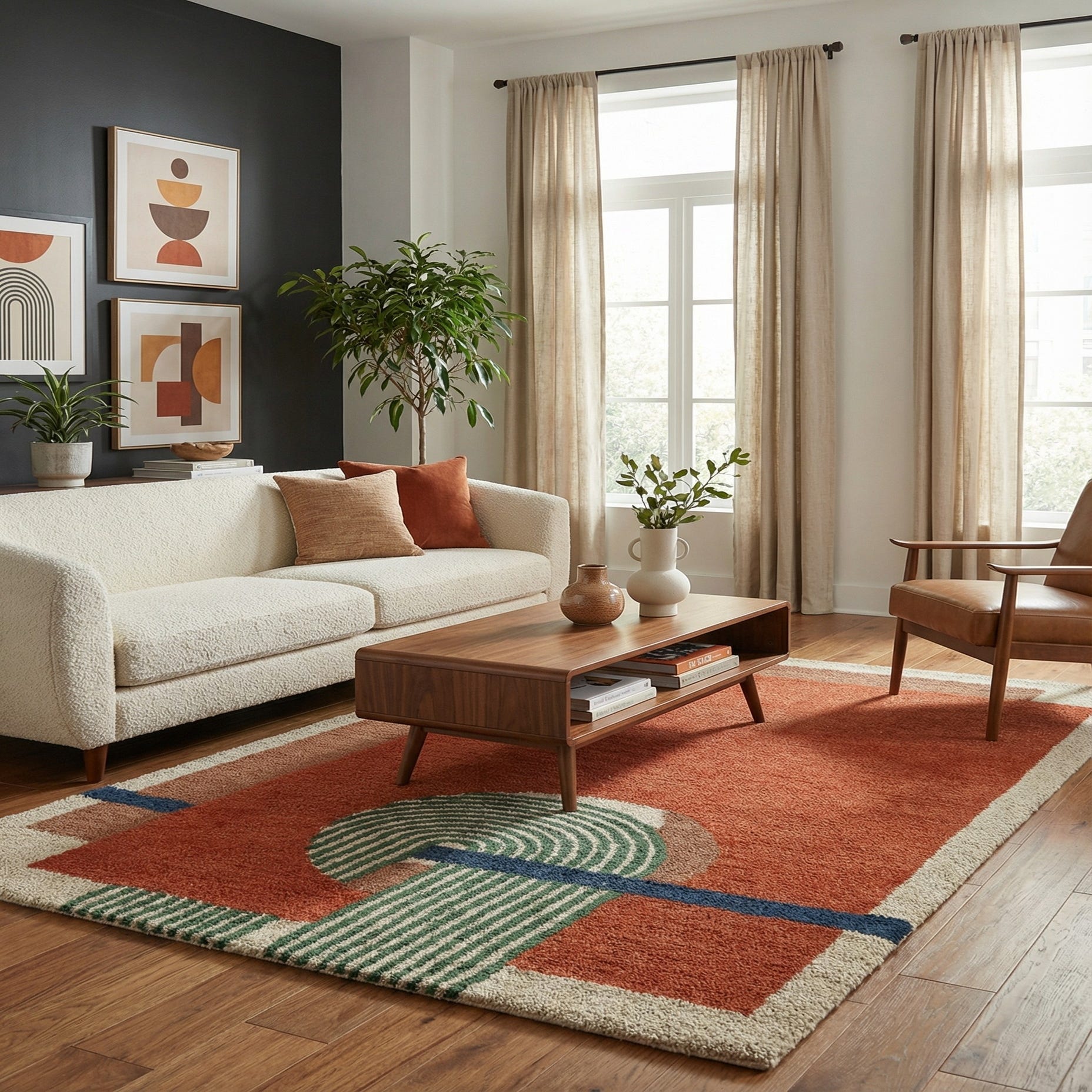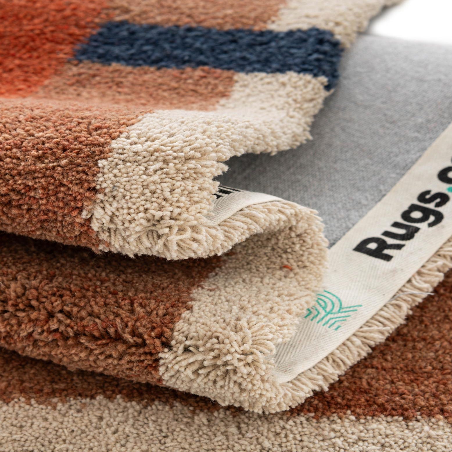 A 5x8 rectangular orange wool rug with a modern geometric design featuring beige, brown, green, and navy blue accents.
