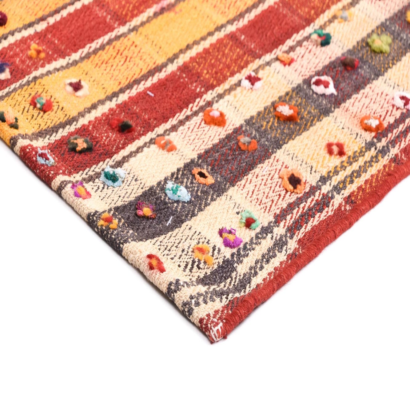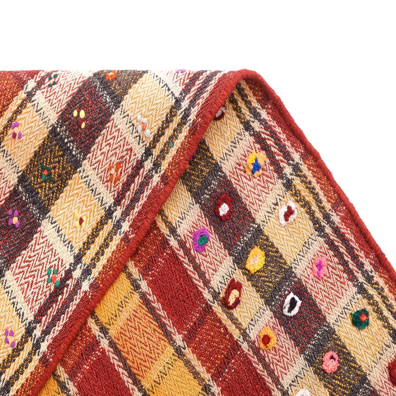 A rectangular 5x8 Jajim rug in warm orange and red plaid, with decorative multicolored stitching along the borders.