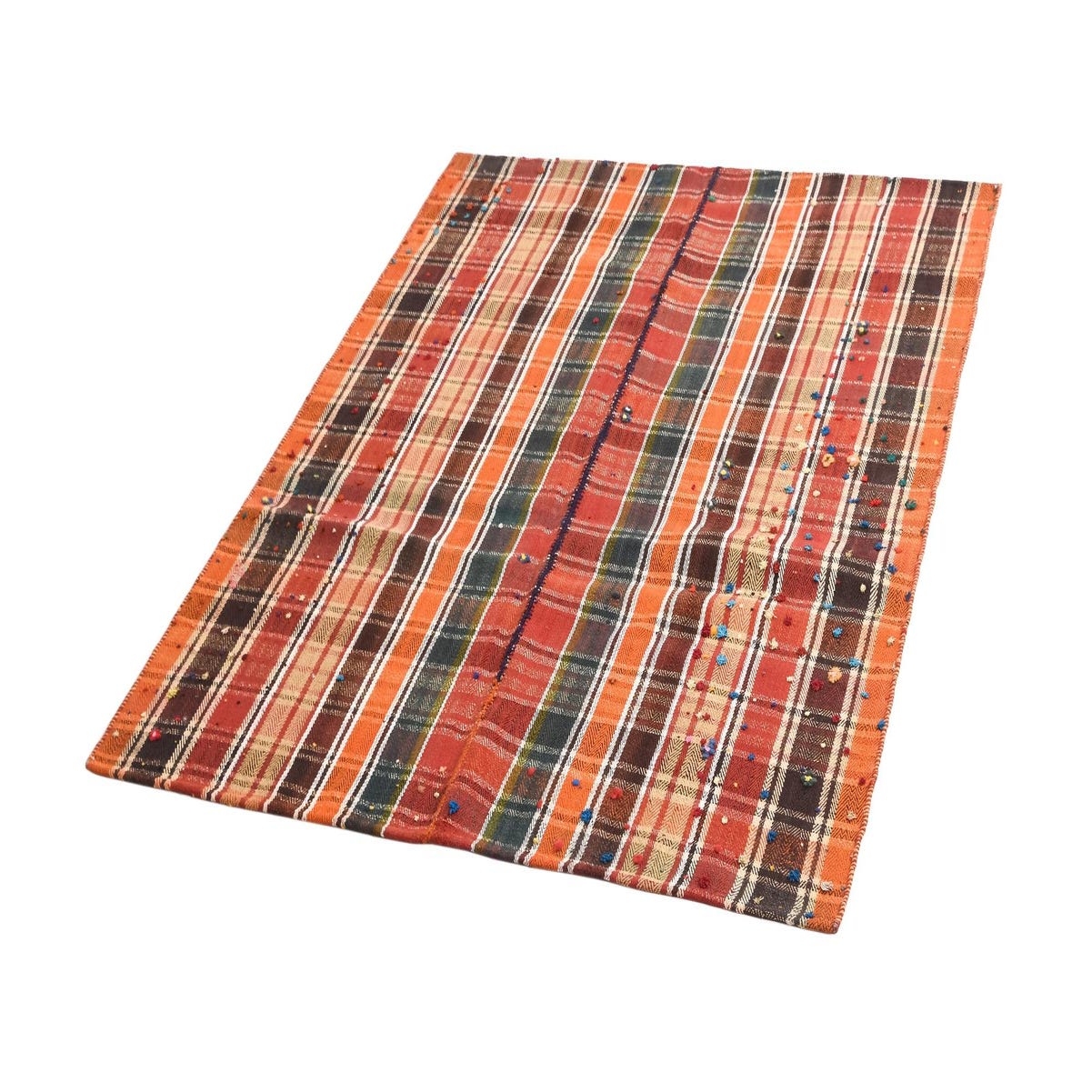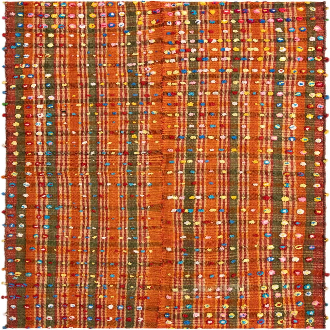A 5x8 rectangular Jajim rug in warm orange with thin green and red stripes, featuring colorful polka dot-like tufts.