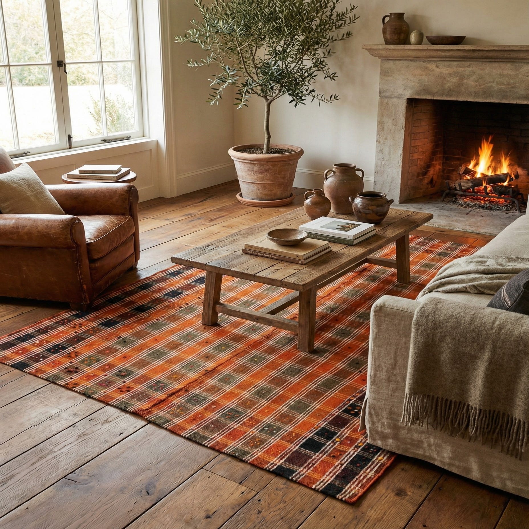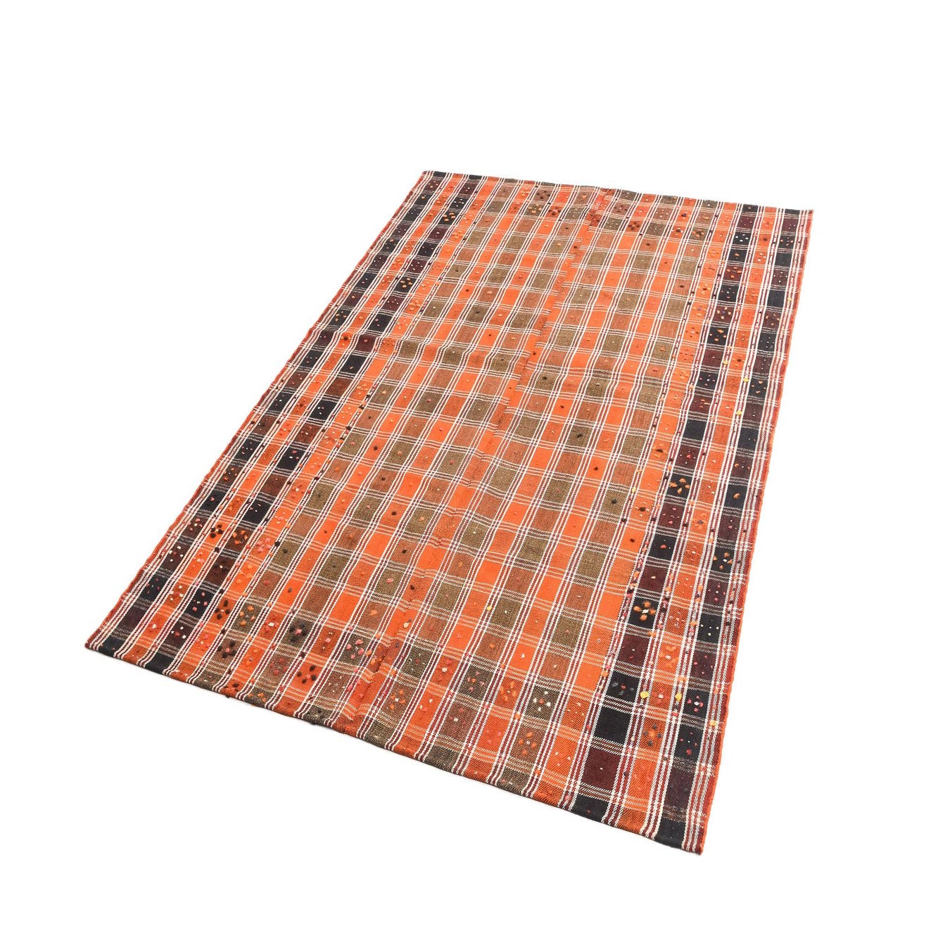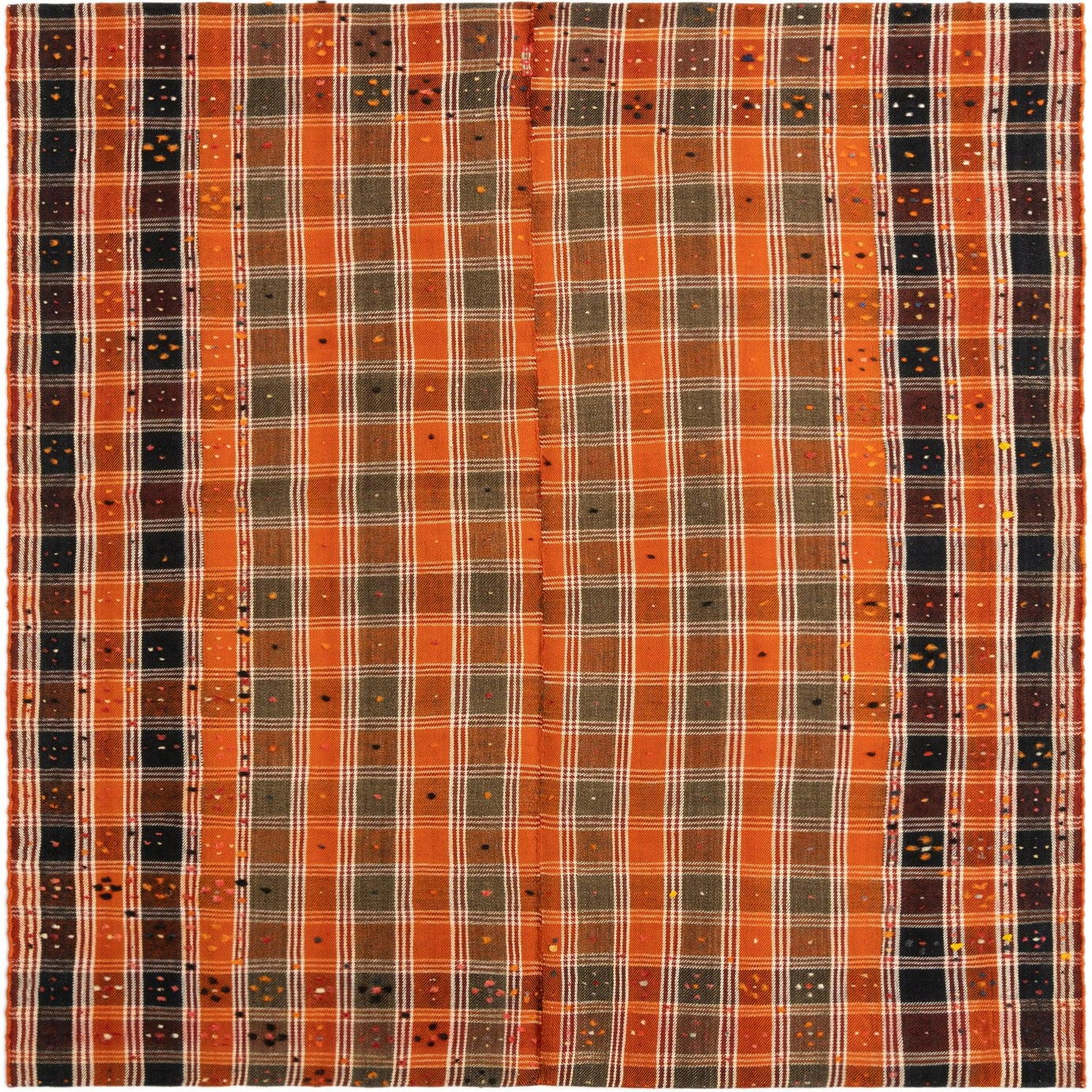 A 5x8 rectangular Jajim Persian rug featuring an orange and brown plaid pattern with colorful flecks.