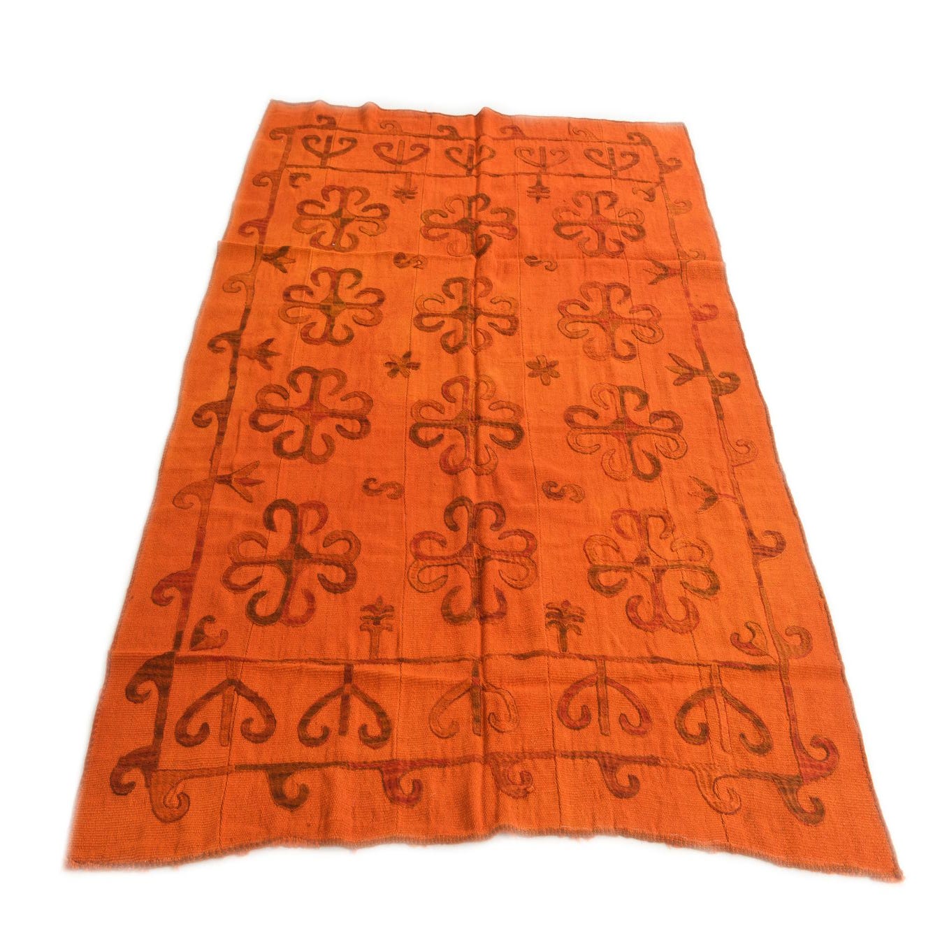 A 5x8 rectangular orange tribal flatweave rug with a repeating pattern of dark orange and red stylized floral motifs.
