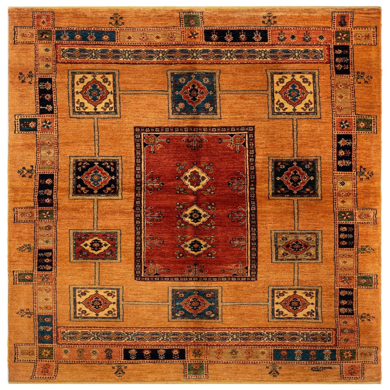 Primary color is Orange. Colors in this rug include: Orange, Orange, Red, Dark Blue, Green, Beige.