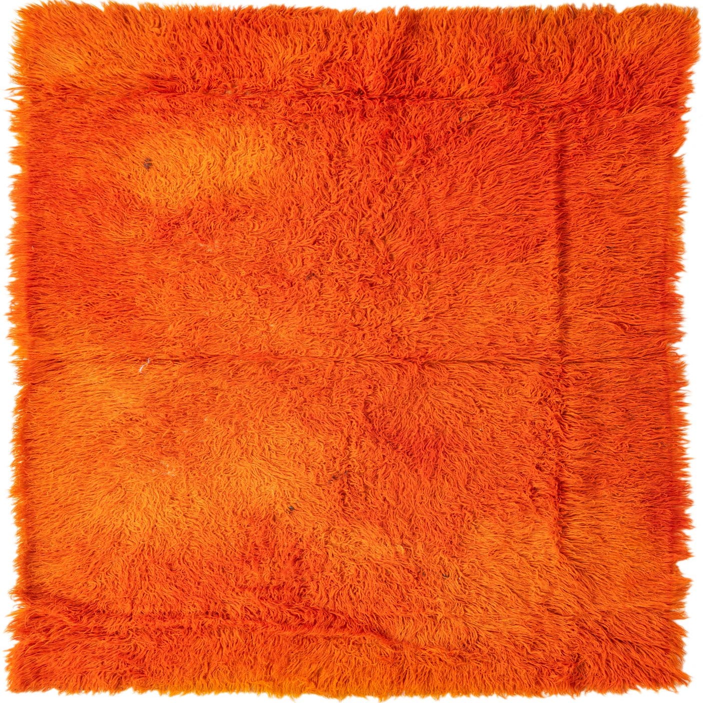A vibrant 5x8 rectangular orange shag rug with a plush, textured pile, perfect for a modern living room.