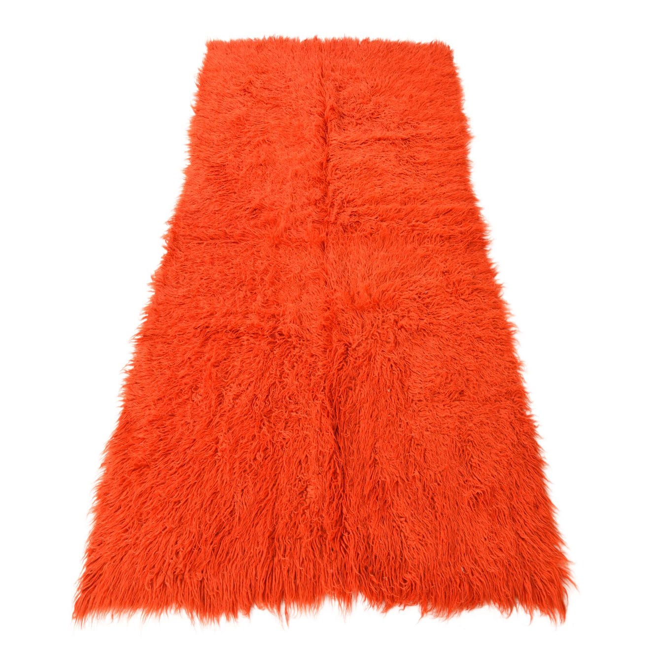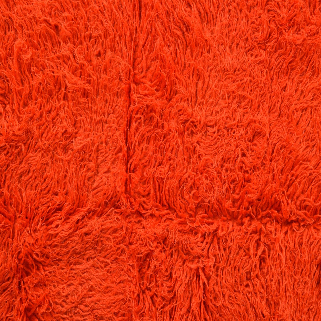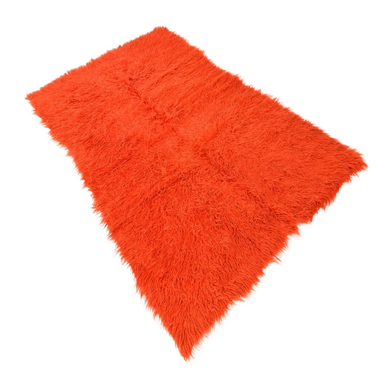 A vibrant 5x8 rectangular orange shag rug with a plush, textured pile, perfect for a cozy living room.