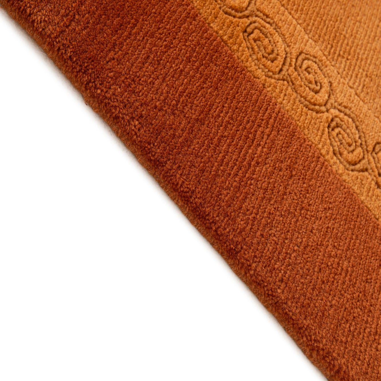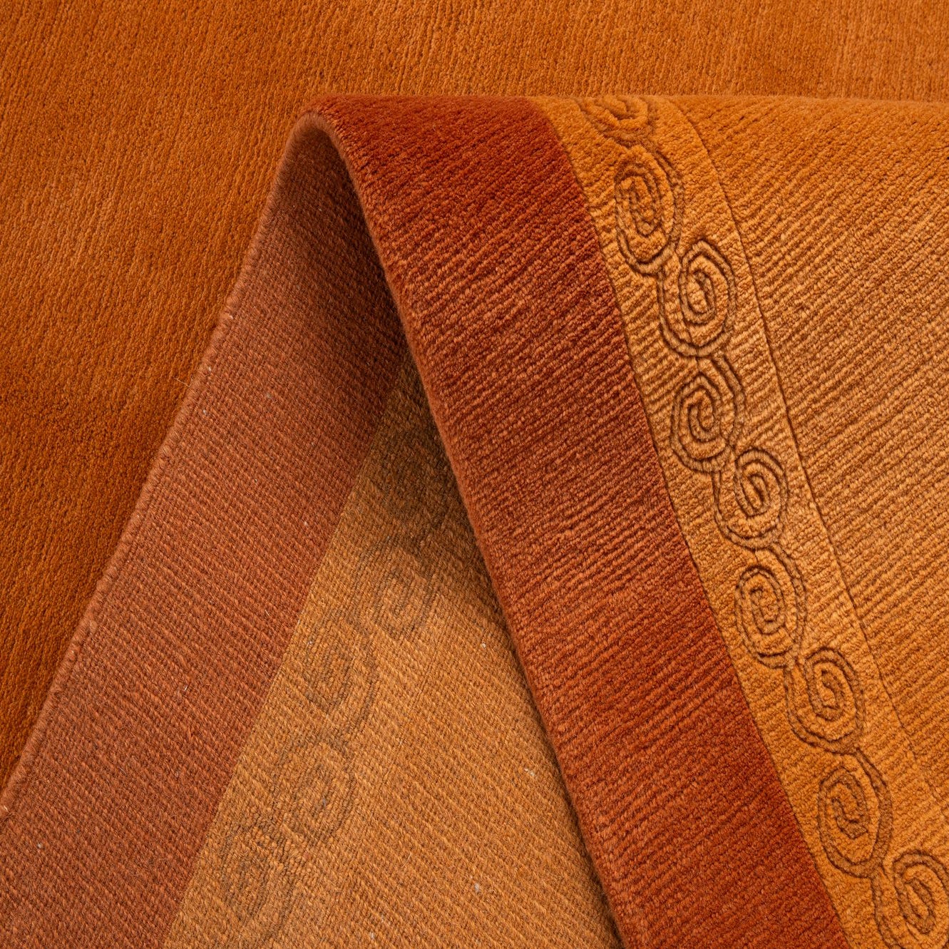 A 5x8 rectangular orange wool rug with a darker orange border featuring a subtle scroll pattern and a delicate green leaf vine.