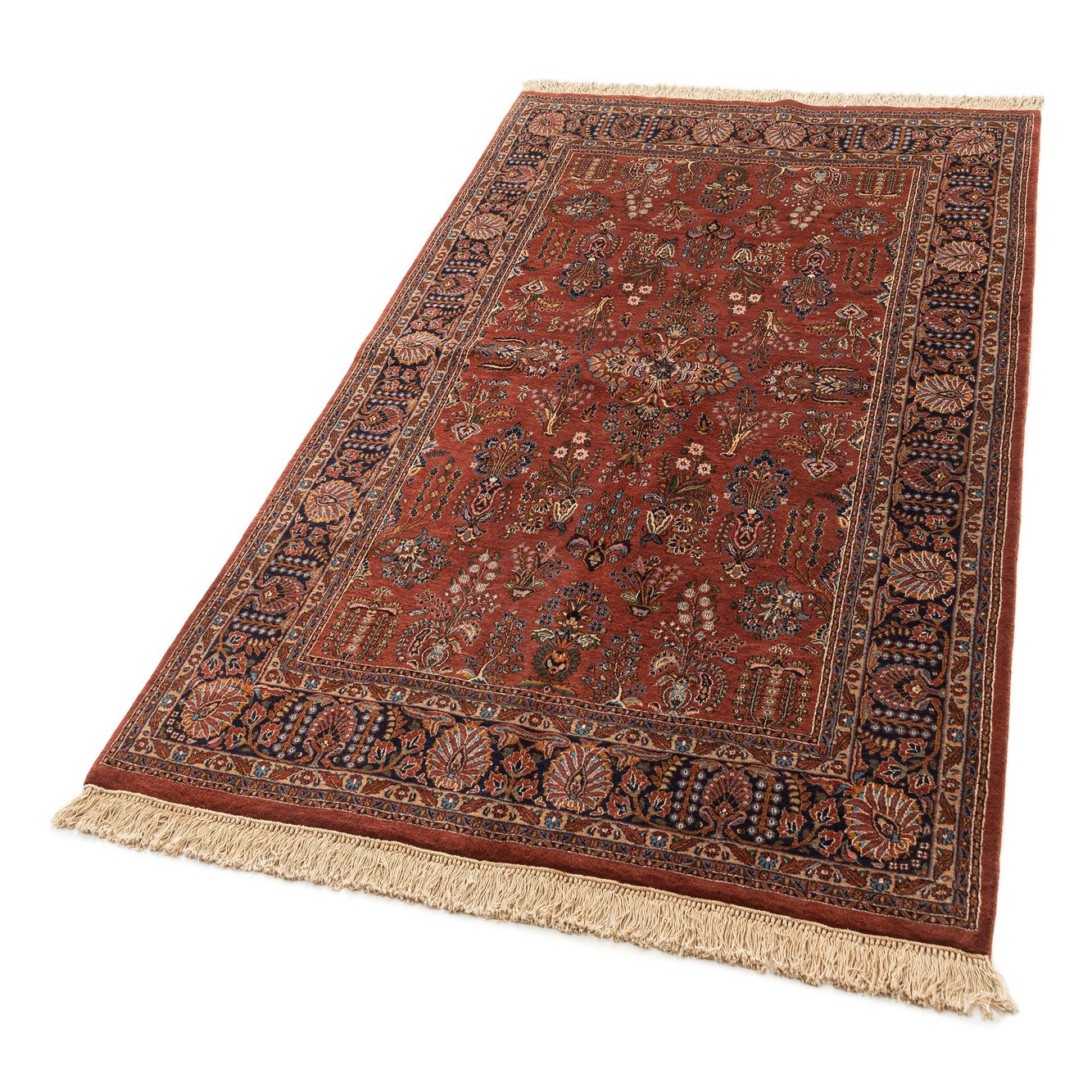 A 5x8 rectangular Sarough rug in rich orange with intricate traditional floral and oriental patterns, featuring a dark blue border.