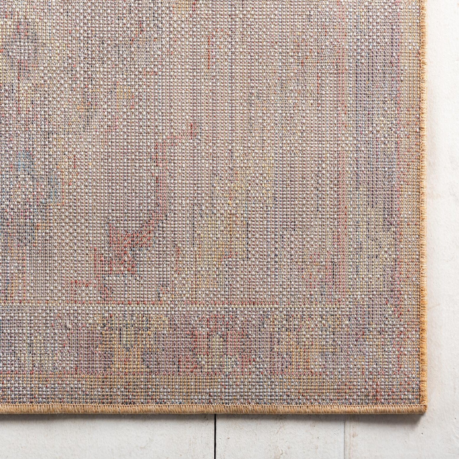 A 5x8 rectangular bohemian rug with a distressed medallion pattern in vibrant oranges, blues, and grays.