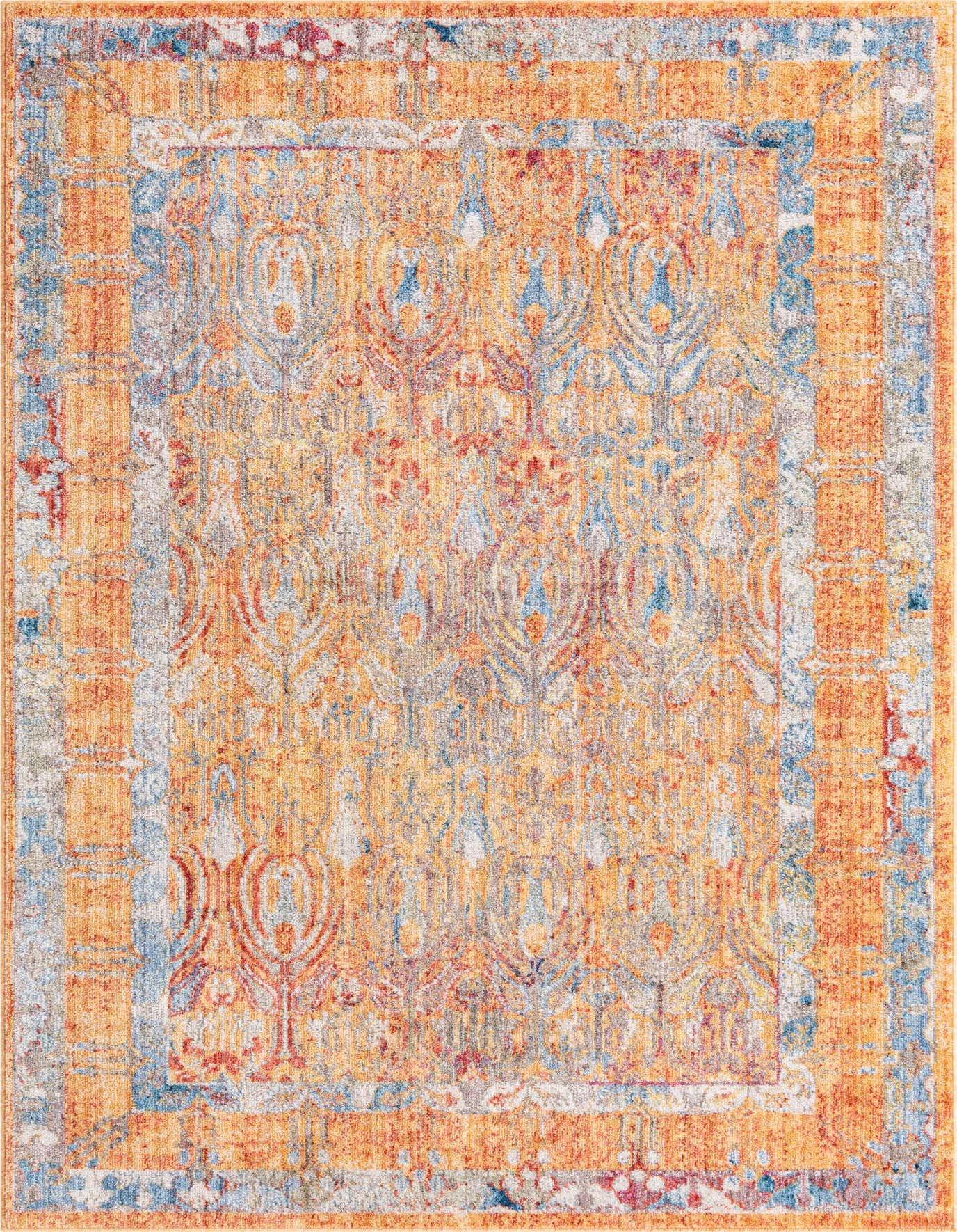 Primary color is Orange. Colors in this rug include: Orange, Beige, Blue, Ivory, Red, Pink.
