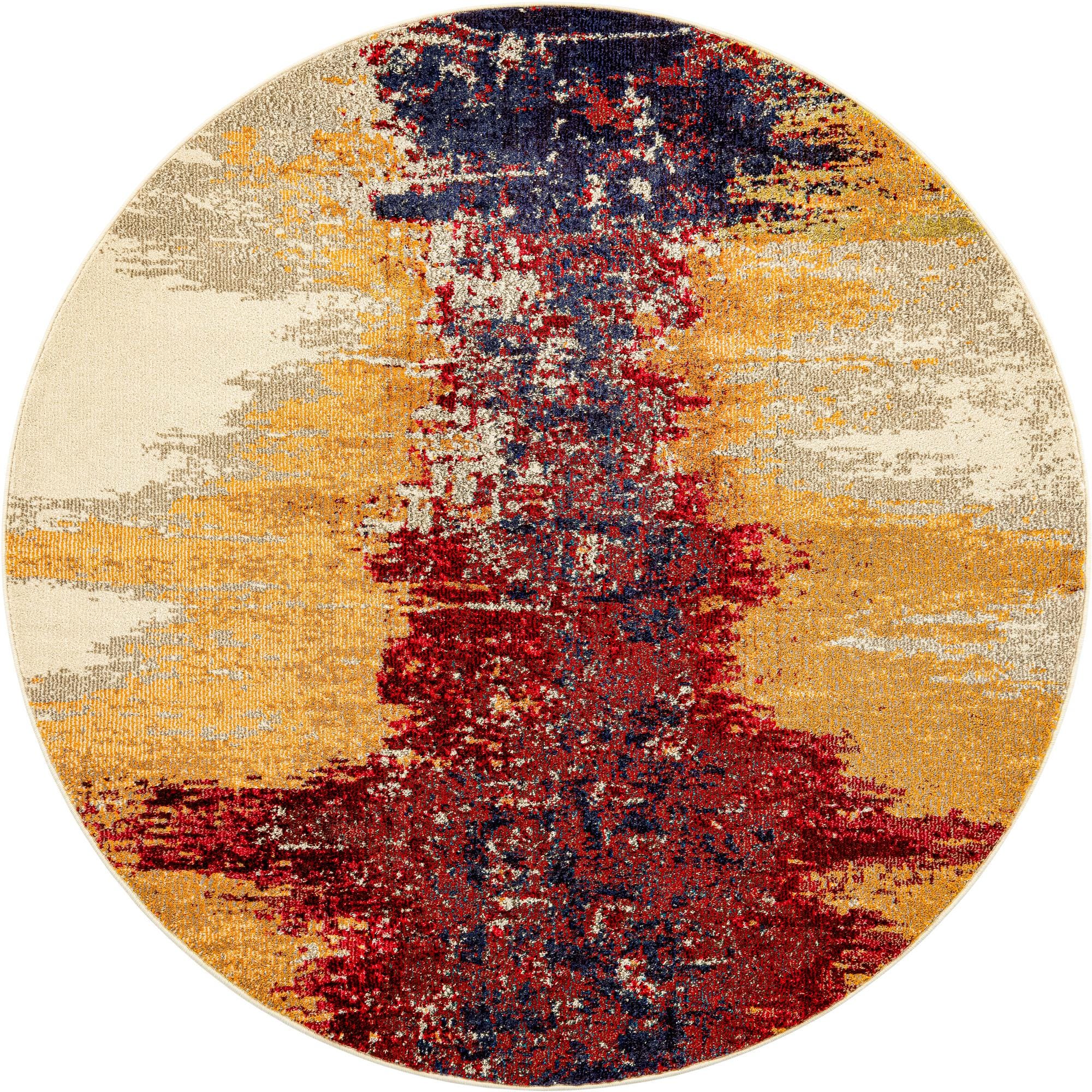 A 6' round orange, red, and blue abstract rug with a modern bohemian design on a light background.