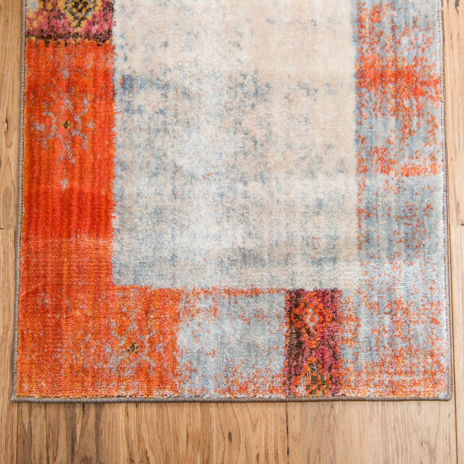 Primary color is Orange. Colors in this rug include: Orange, Blue, Brown, Cream, Purple.