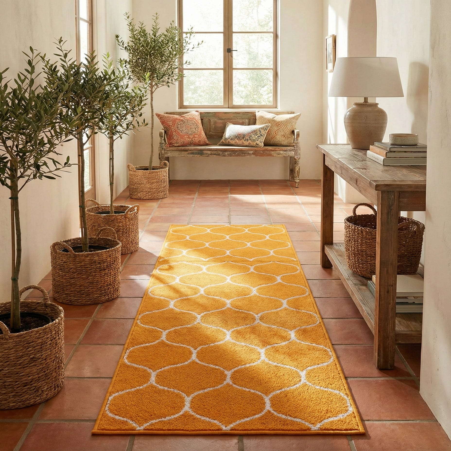 Use this piece to warm up a narrow hallway or to lead the eye down an entryway; its color and pattern work well where a bright accent is needed. It pairs nicely with neutral furnishings in contemporary or transitional interiors, complements mid-century modern wood tones, and adds a lively layer to eclectic or bohemian schemes. Place it in a kitchen galley or along the side of a bed to introduce color and a tactile surface without overwhelming the room.