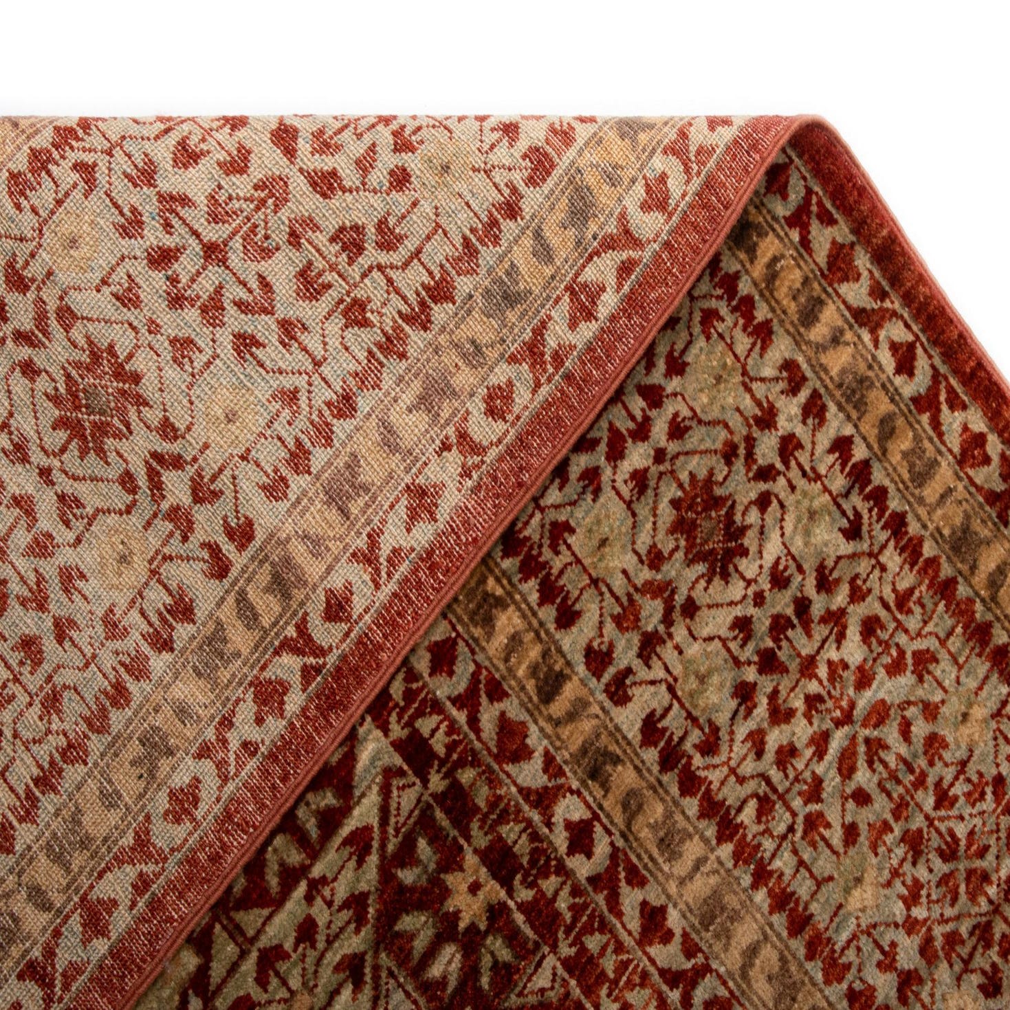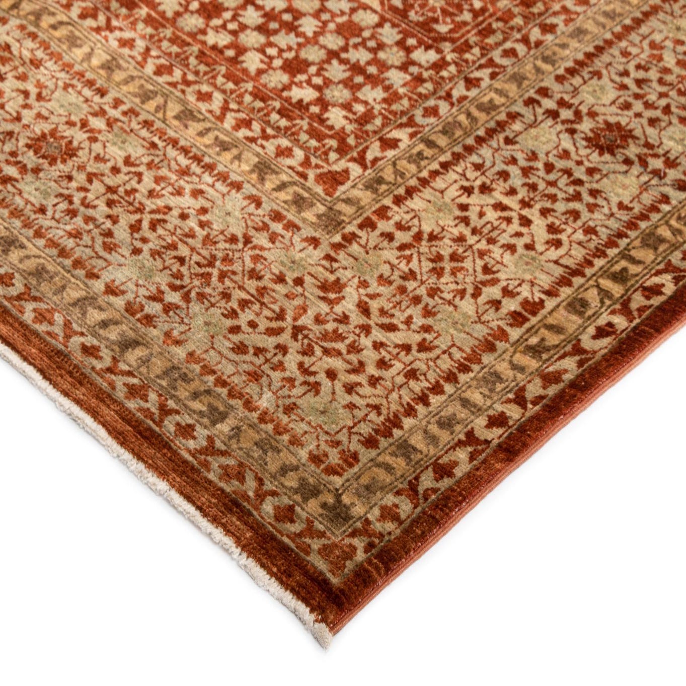 This Amina rug would complement interiors that lean towards traditional or transitional styling. It would be equally at home in a formal living room or dining space as it would add a sense of warmth and depth to these environments. The earthy and warm hues can be paired with wooden furniture, warm-toned leathers, and natural textiles to create a cohesive and inviting aesthetic. Alternatively, set against a minimalist decor, the Amina rug could serve as a striking focal point, bringing color and texture to a more subdued interior palette.