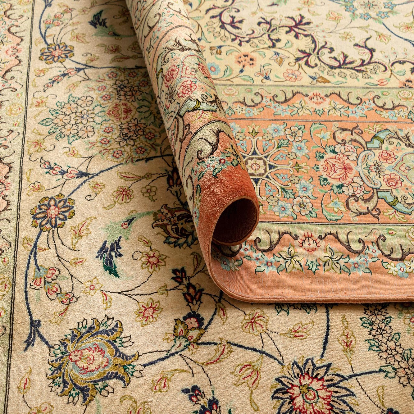 A 6x9 rectangular Persian silk rug with a cream field, a central navy medallion, and an intricate orange border.