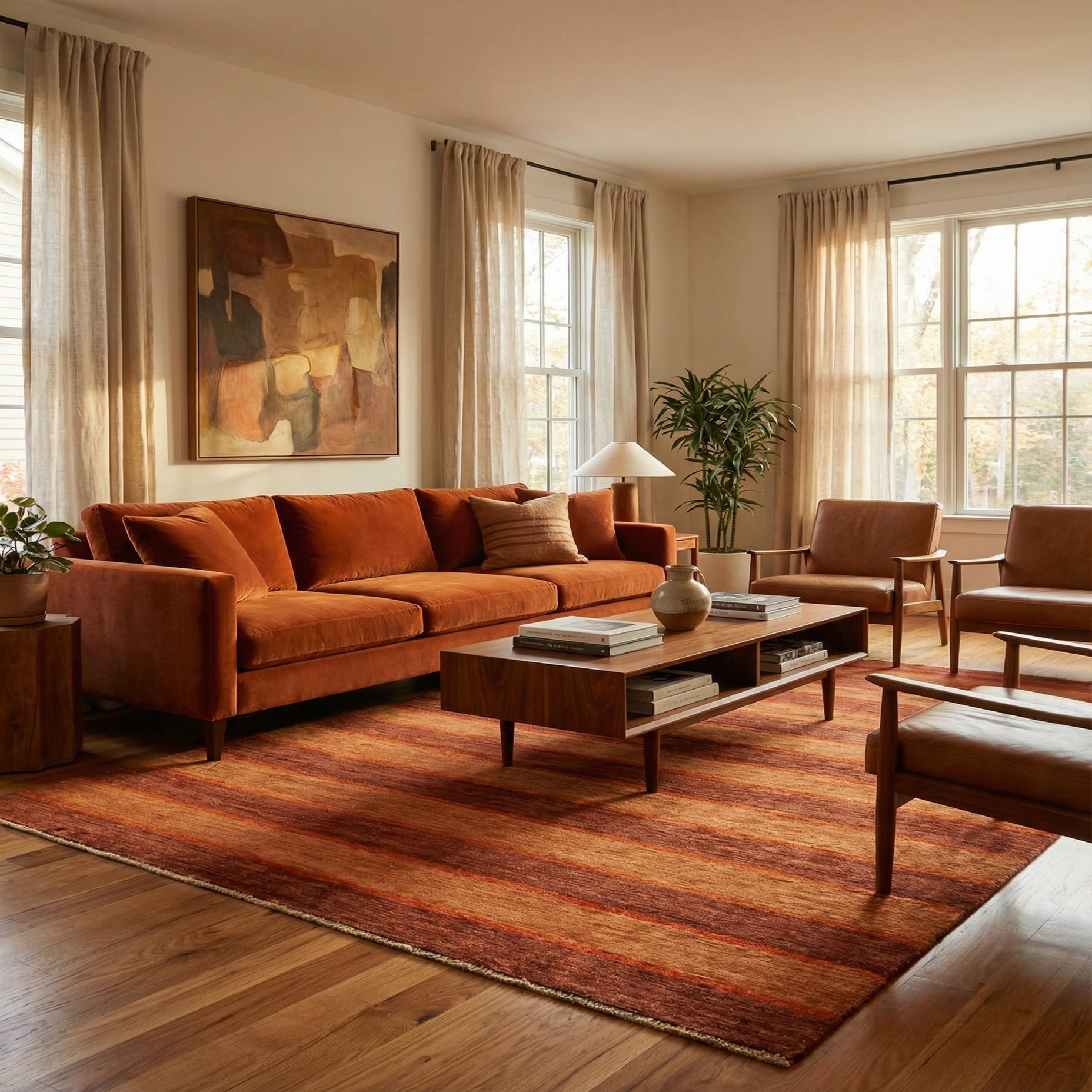 A 6x9 rectangular Modern Ziegler rug featuring horizontal stripes in varying shades of orange and rust, made from hand-spun wool.