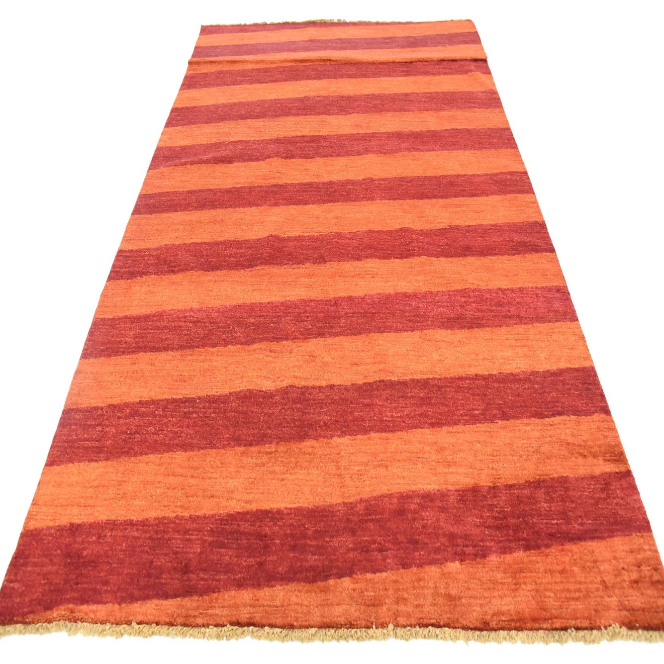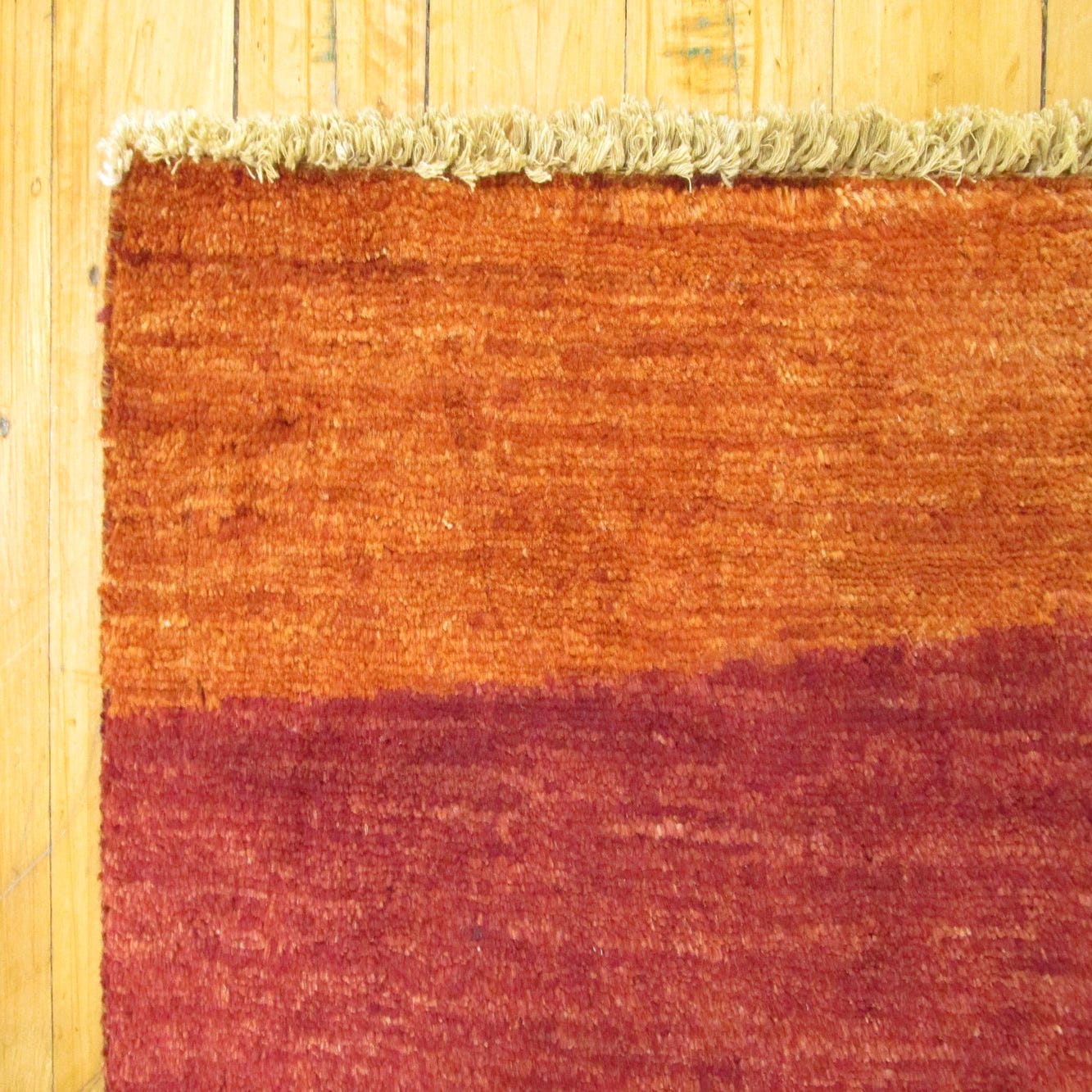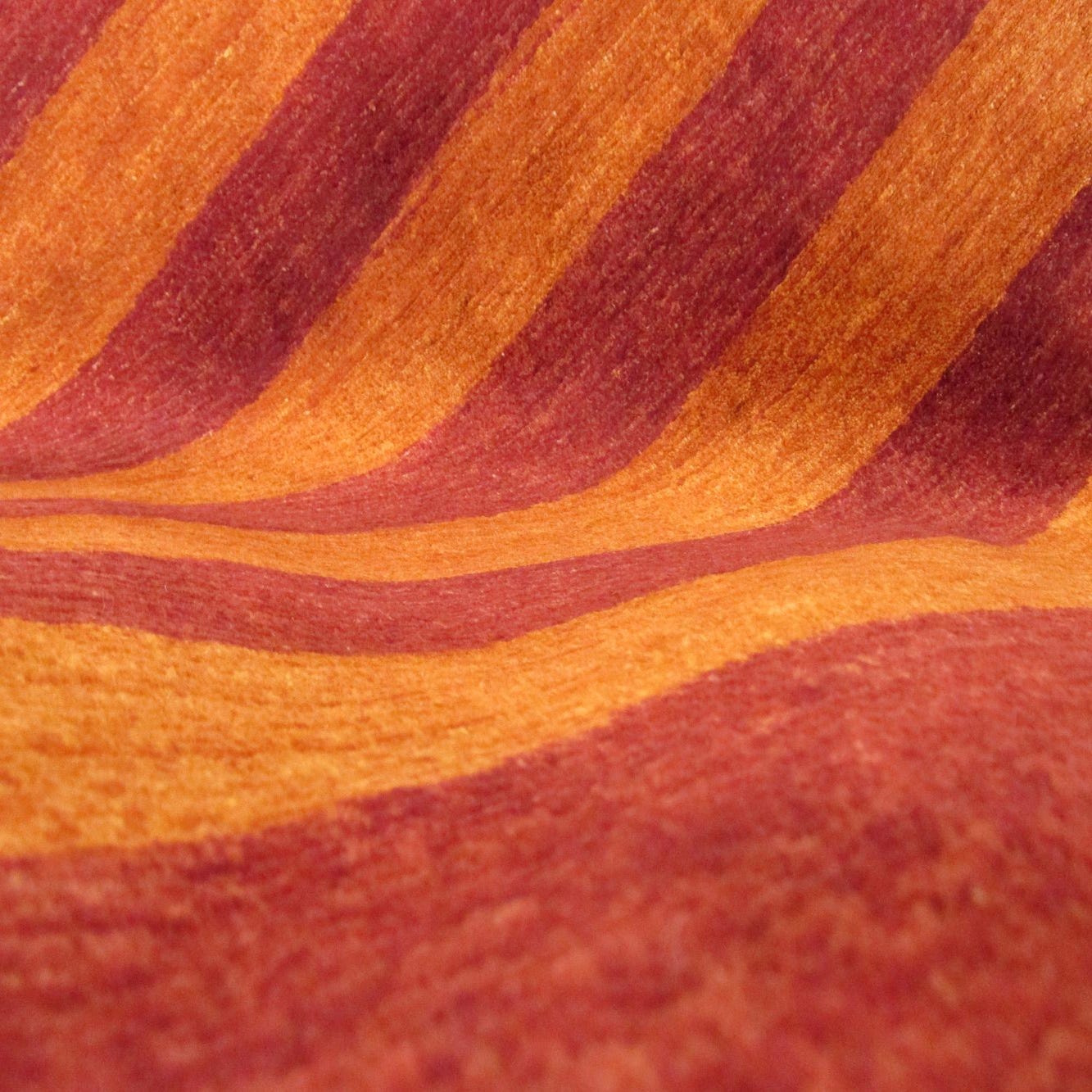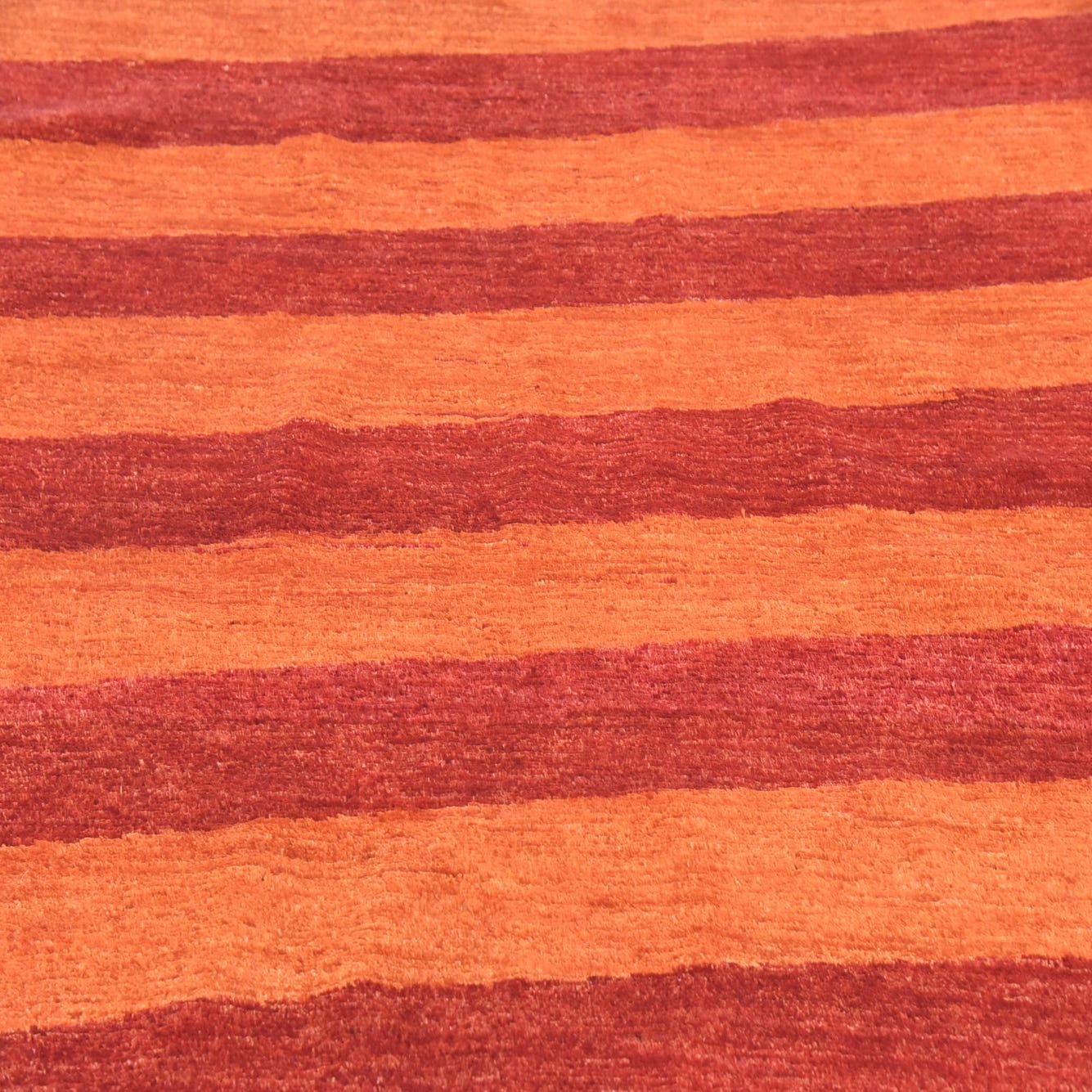 Wide, horizontal bands of rich red alternate with a warm orange background to create a bold yet restrained striped pattern. The hand-knotted construction in 100% hand-spun wool produces subtle tonal variation within each stripe and a soft, tactile pile that compresses slightly underfoot, giving the surface a gently lived-in look and a comfortable, dense hand. The finish along the short ends shows a minimal fringe, and the natural wool fiber carries a low sheen that catches light without drawing attention away from the pattern.