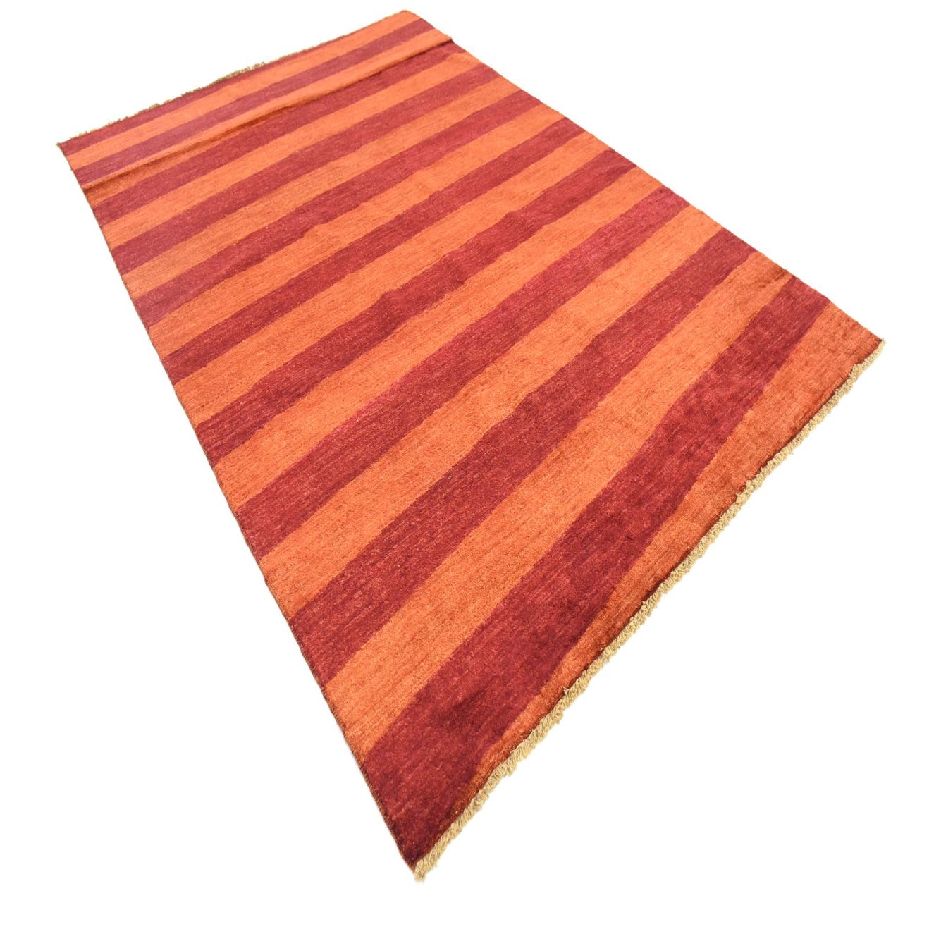 This rug suits living rooms, dining areas, or home offices where a warm color anchor is needed—place it beneath a sofa and coffee table to define a seating area, under a dining table to ground wood furniture, or in a study to add color alongside leather and metal accents. Its straightforward stripe and warm palette pair well with mid-century modern and contemporary furnishings as well as layered, eclectic interiors that use natural textures like linen, wood, and brass.