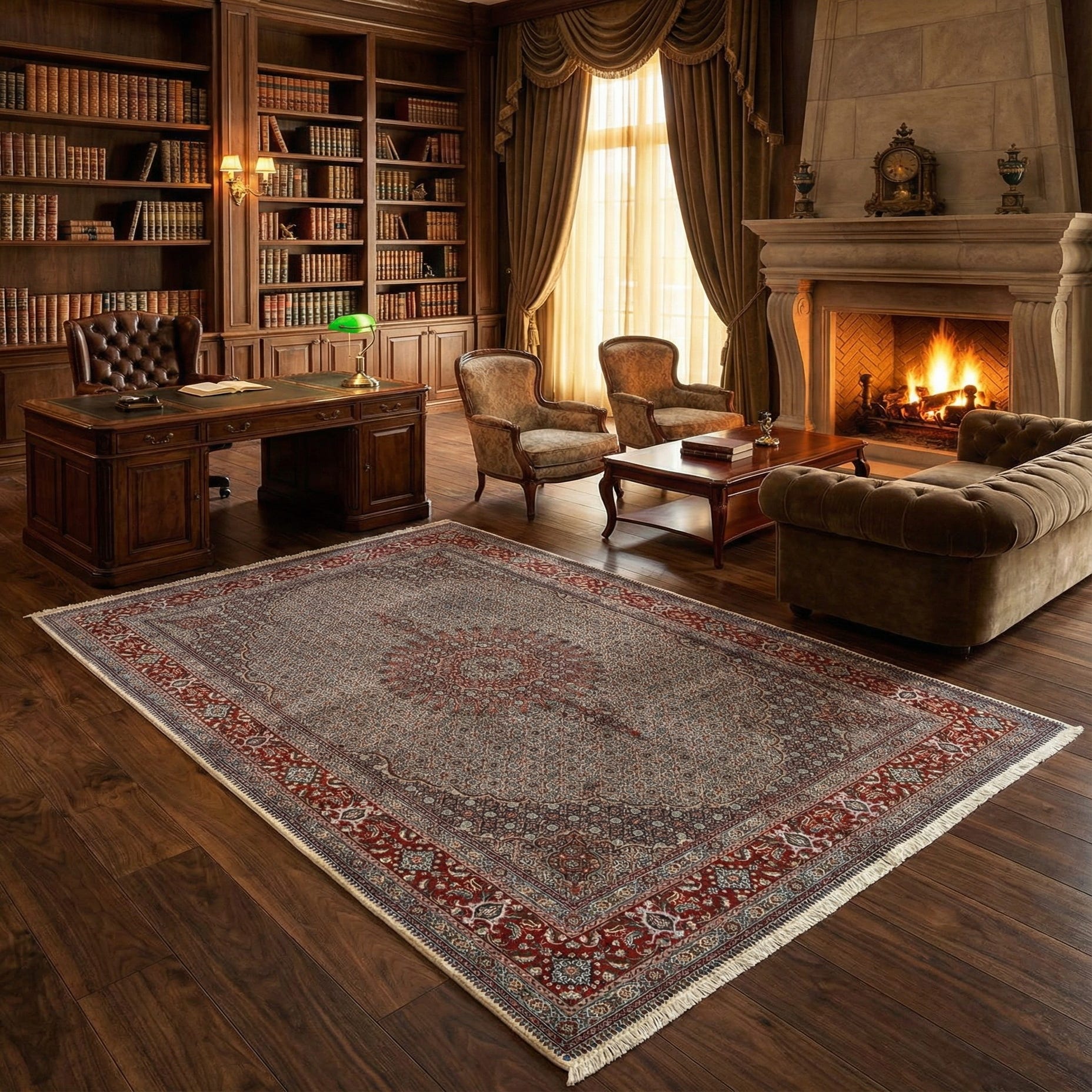 A 6x9 rectangular Persian wool rug featuring a central medallion and intricate floral patterns in shades of orange and red.