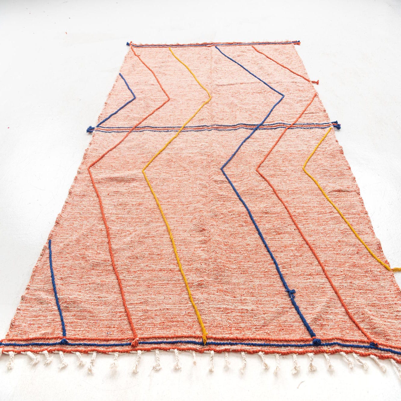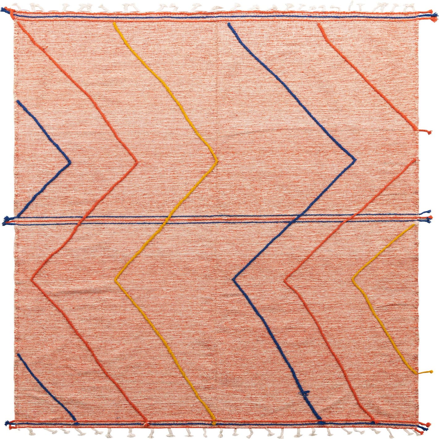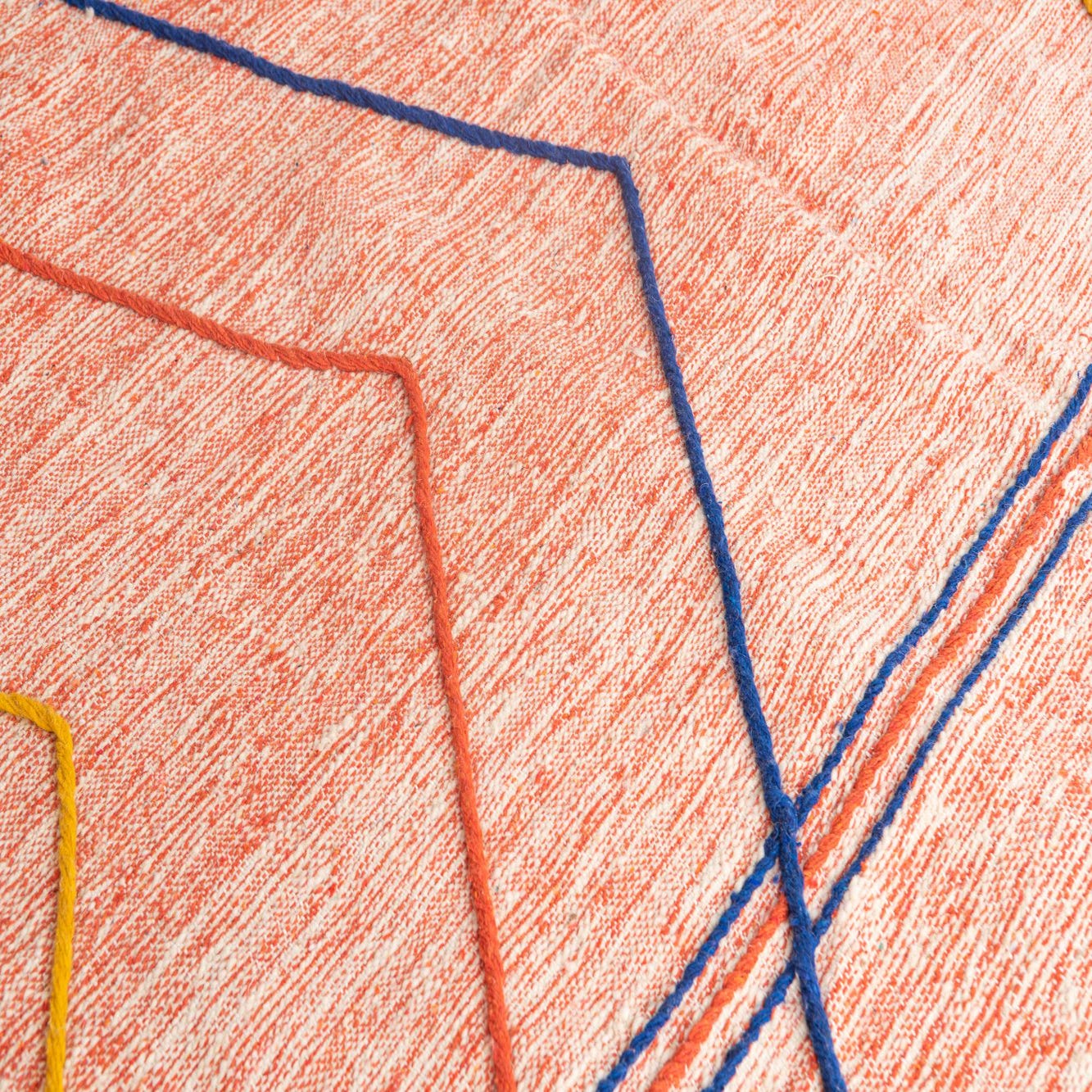 Primary color is Orange. Colors in this rug include: Orange, Blue, Ivory, Yellow.