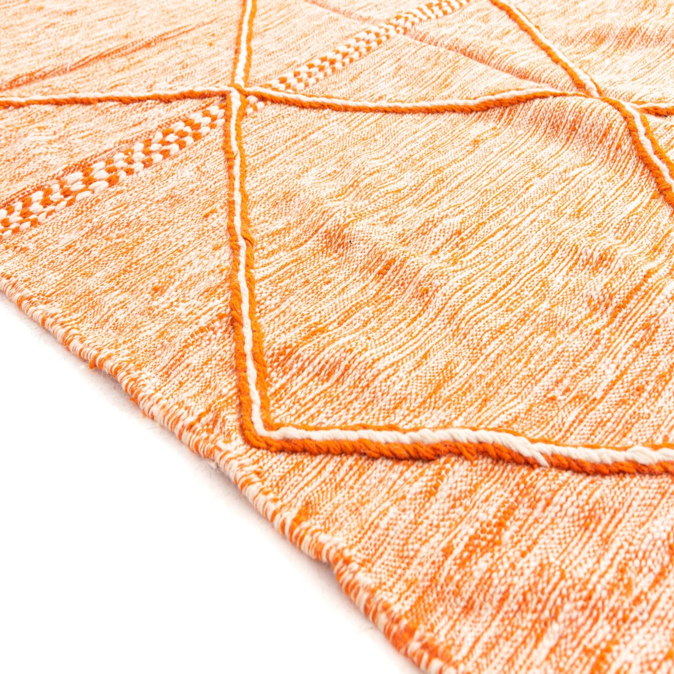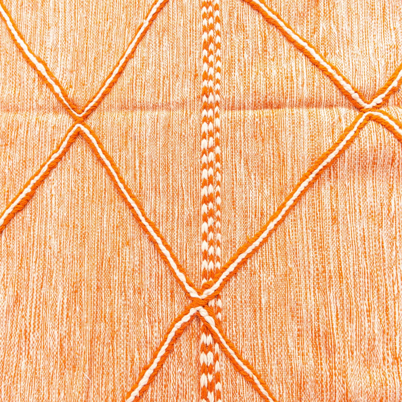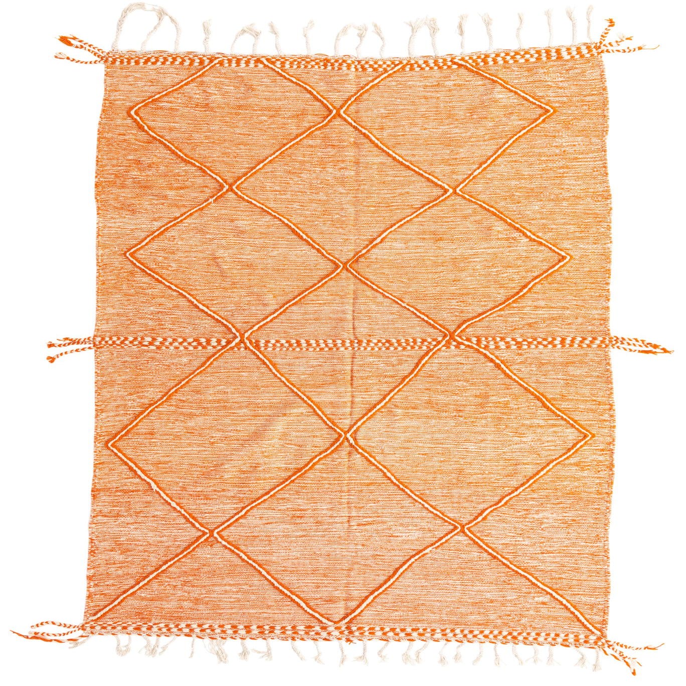 A 6x9 rectangular orange Moroccan shag rug with a white tribal diamond pattern and fringe tassels.